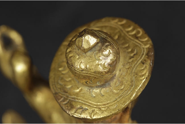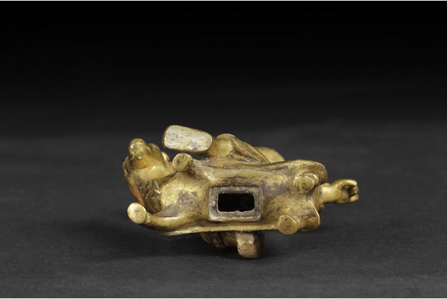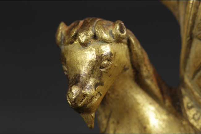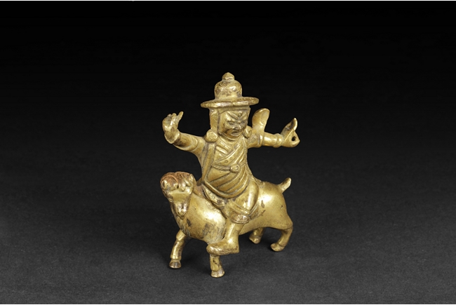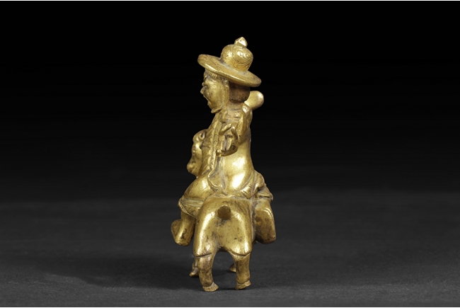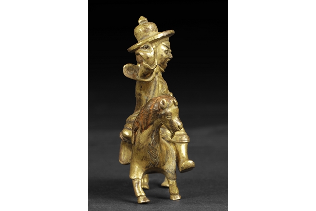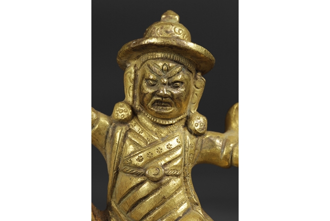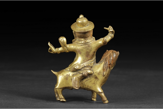 The figure depicts a rider on a horse; the rider with arms spread open, wearing armor and helmet, while looking sideways. Qing Dynasty period.