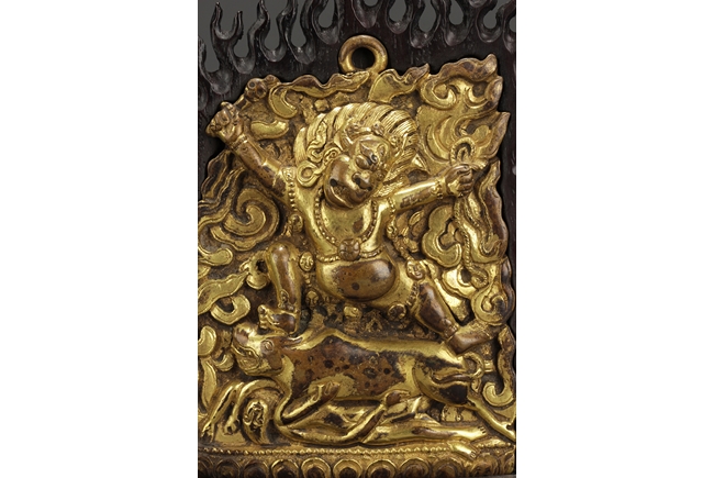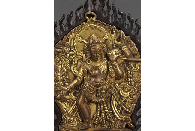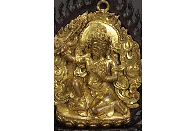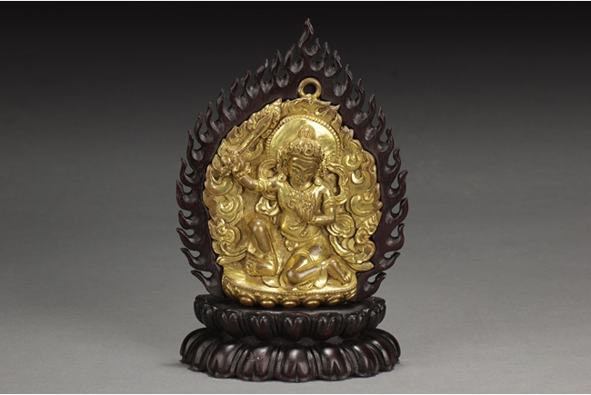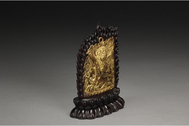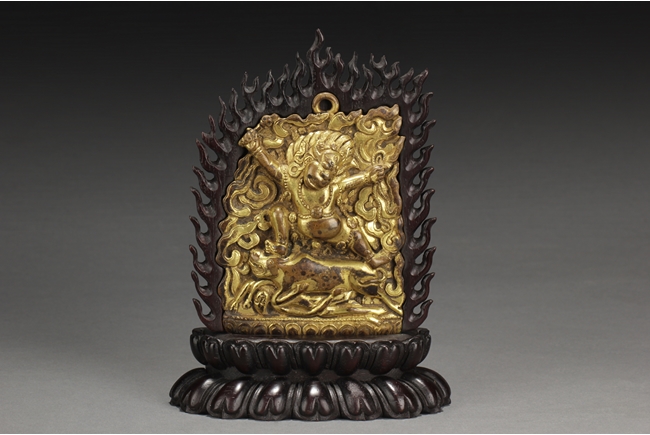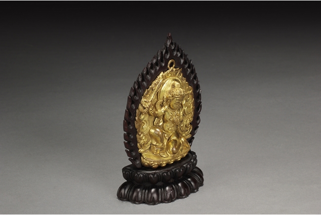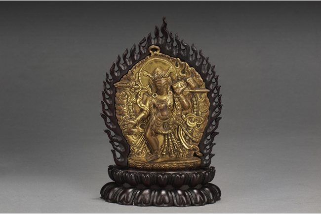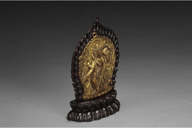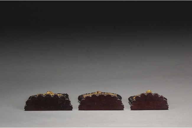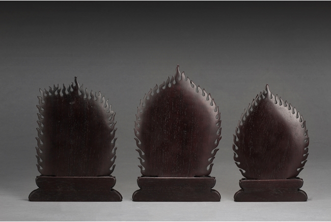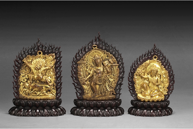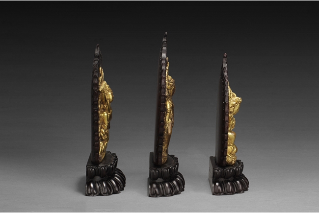 The three Buddha all stands on lotus throne, with fiery mandorla in the back, dressed with beaded ornaments, and carrying religious instruments. The en-suite Zitan wood stand carved with double lotus thrown, with fiery mandorla on the back. Mid Qing Dynasty period. Provenance: Rosily Museum of Taiwan