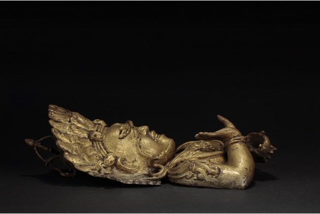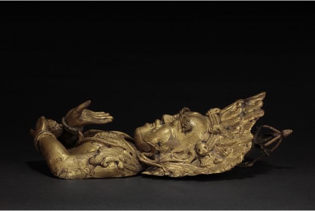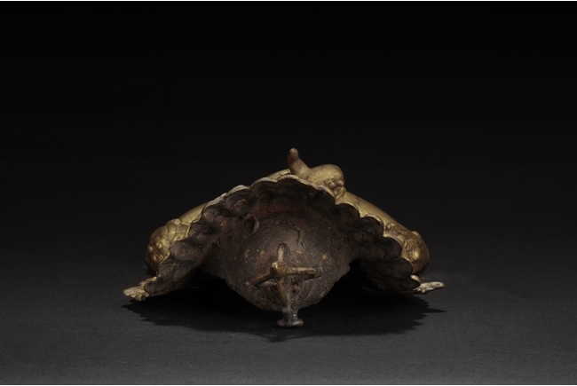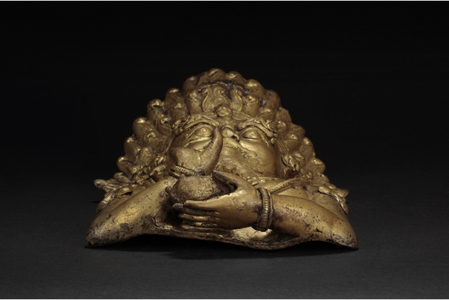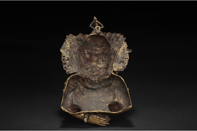 The Buddha's left hand holding a small container, the right hand with palm outwards, dressed with snake-like adornments and crown, and a third eye on the forehead. The reverse shows it is mostly hollowed. 18th century.