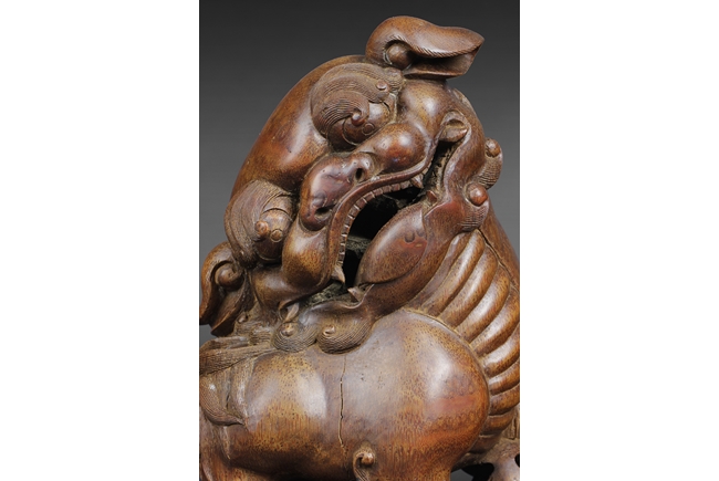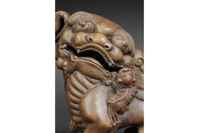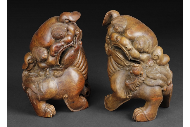 Both guardian lions depicted with head turning sideways and with a playful expression; the male lion holds a ball under his left paw, while the female lion has a small cub on her side. 19th century.