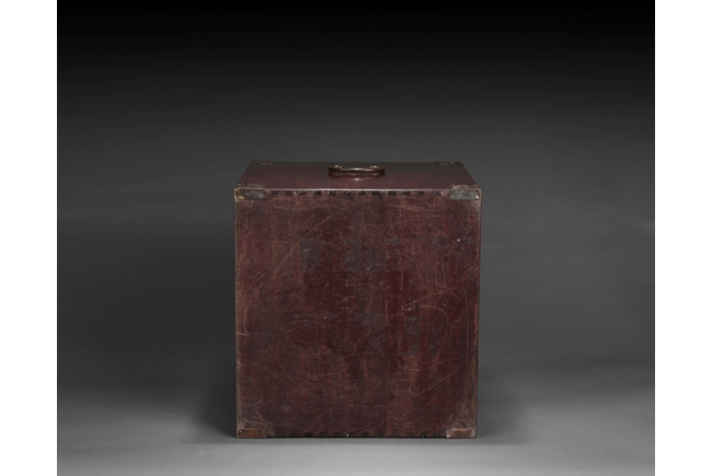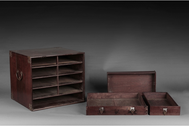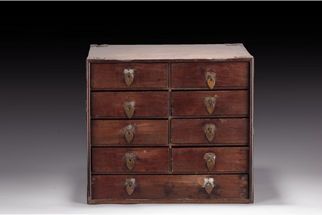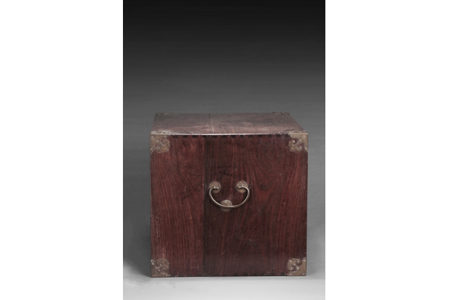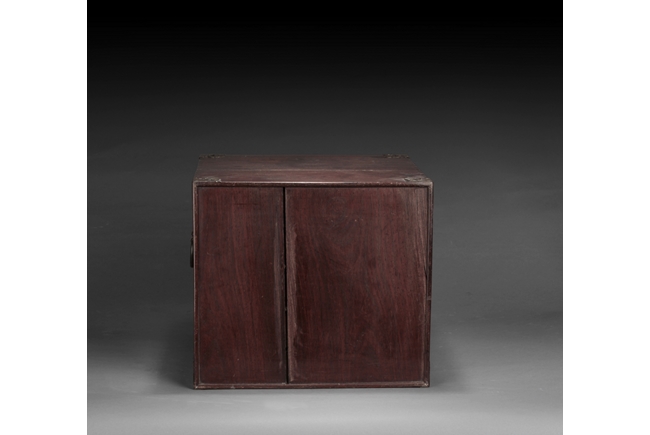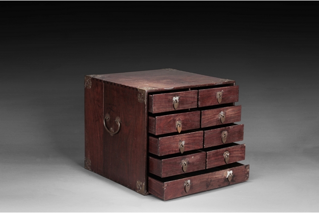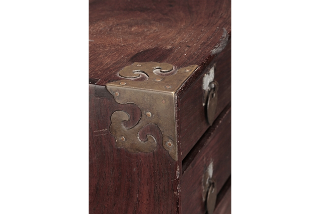 Of square form, the cabinet includes nine total drawer compartments, eight drawers are of same size, while the bottom drawer is the size of two drawers combined, all with bronze handles. The cabinet's corners are enforced by bronze , and two sides with bronze lifting handles. The wood of typical Hainan Huanghuali, with natural color and grain. Qing Dynasty period.