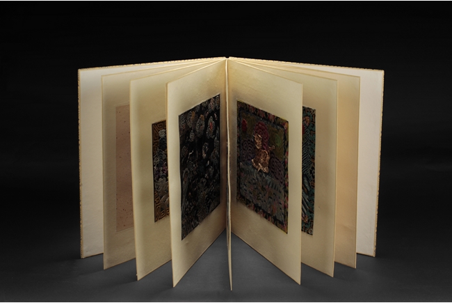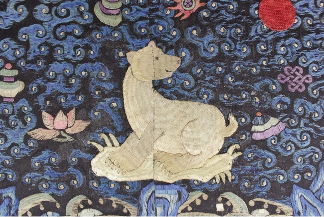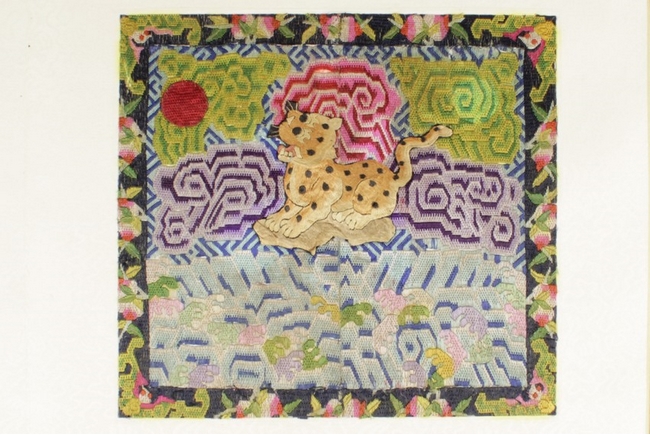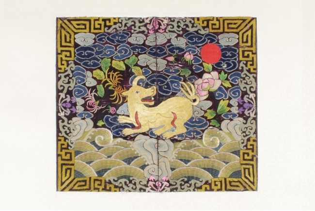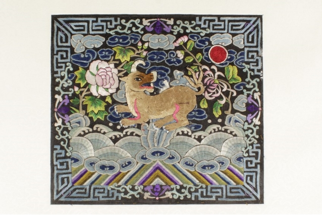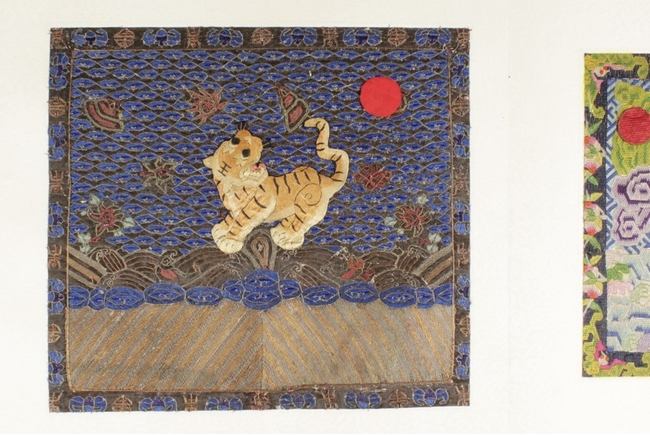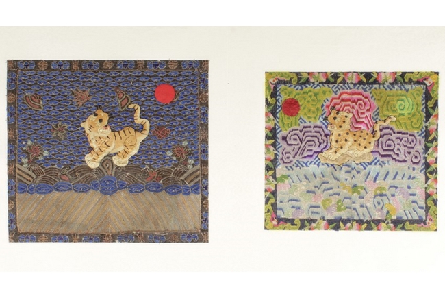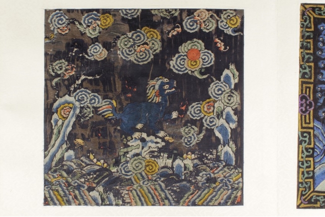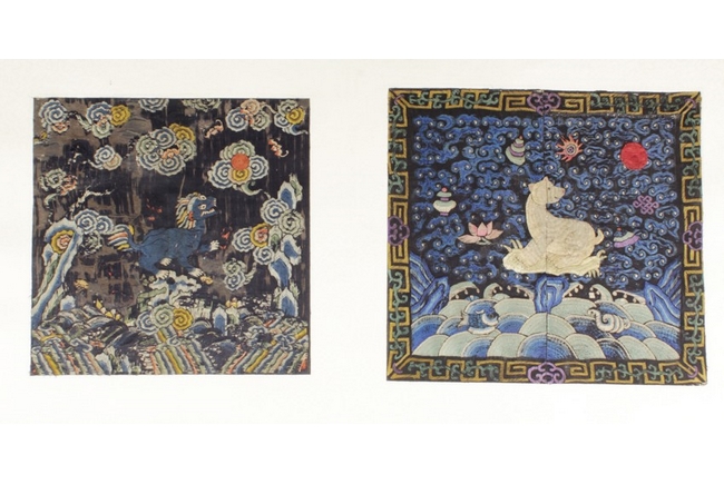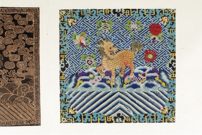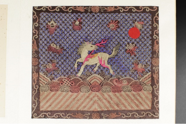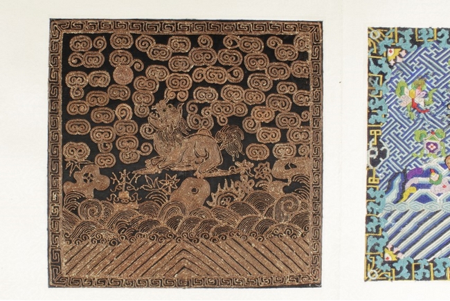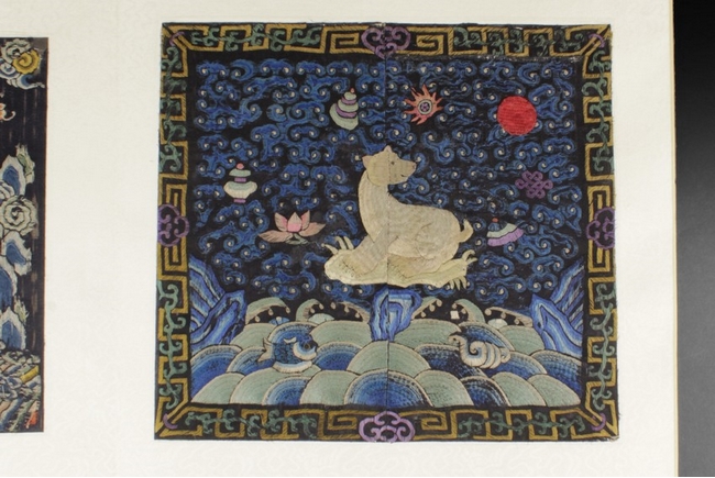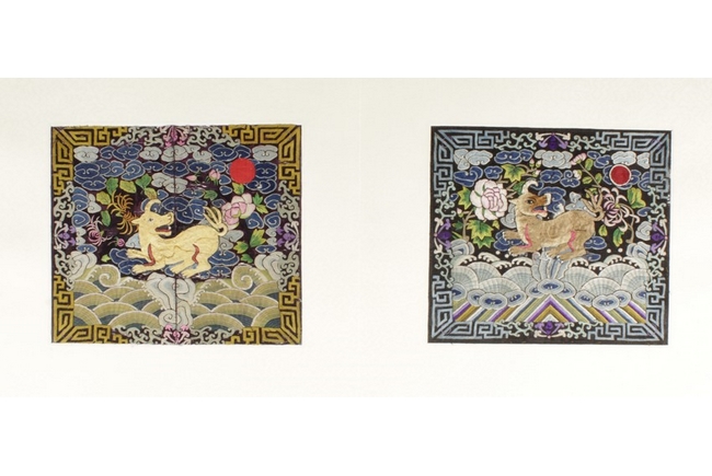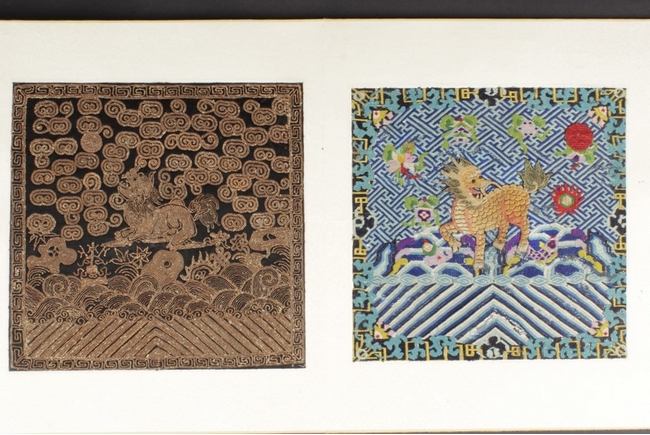 The booklet contains all nine cloth military official rank badges, or Mandarin square, from Qing Dynasty. The embroidered badge were designed to be sewn onto the surcoat of an official, usually embroidered with detailed, colorful animal or bird insignia indicating the rank of the official. Qing Dynasty period.