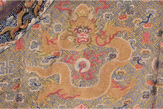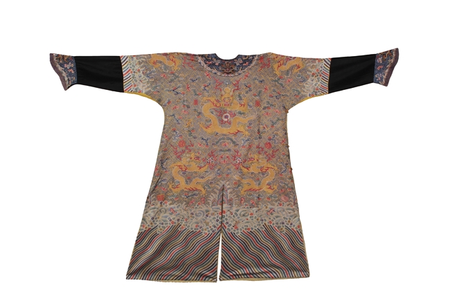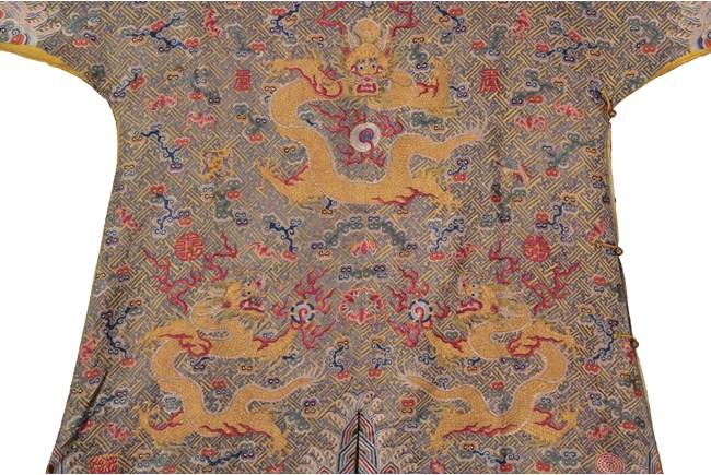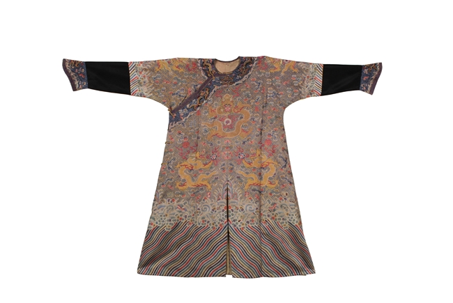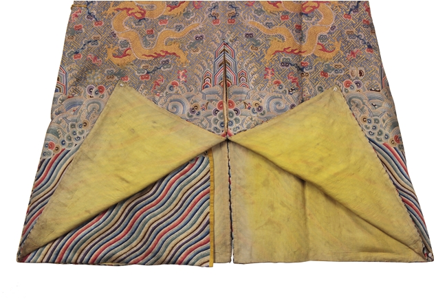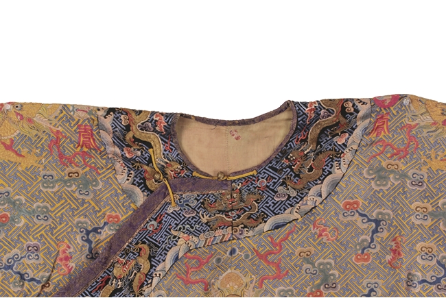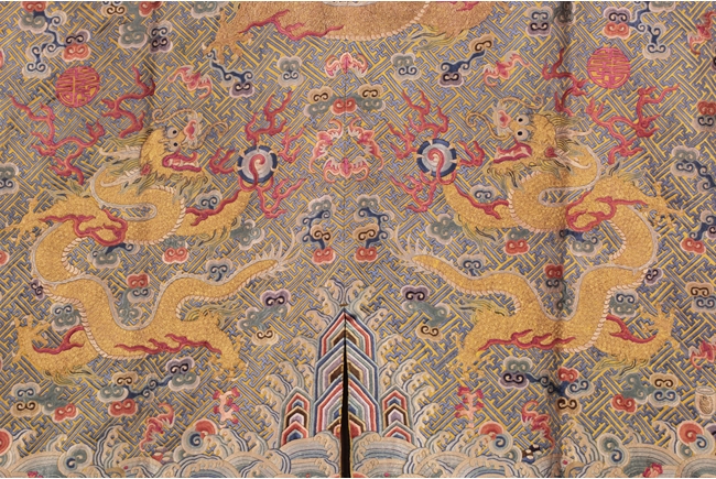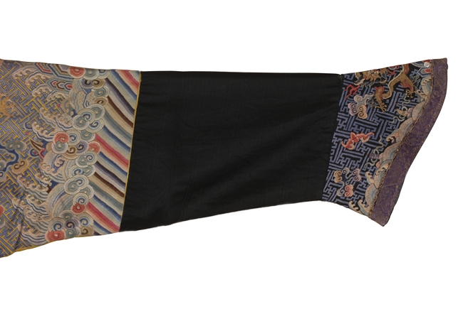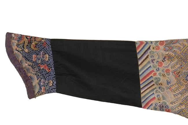Finely woven in shades of blue, green, purple, ochre, and gold with nine contorted five-clawed dragons confronting flaming pearls amidst dense, stylized ruyi clouds interspersed with bats clutching wan emblems or double peaches and shou characters, the twelve imperial symbols arranged in three groups of four, and lishui stripe with Eight Treasures at the hem, with dark blue-ground cuffs. Qing Dynasty period.