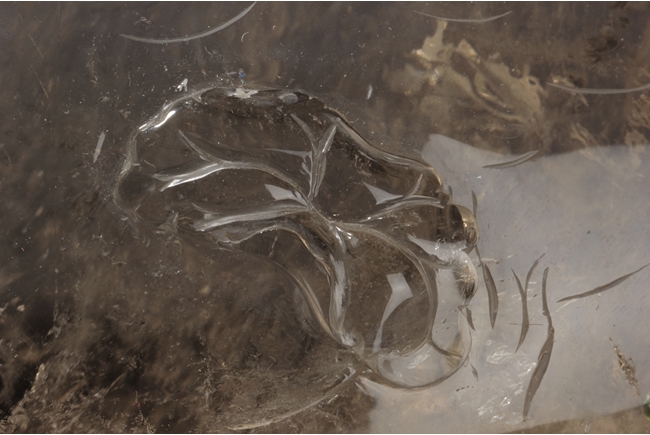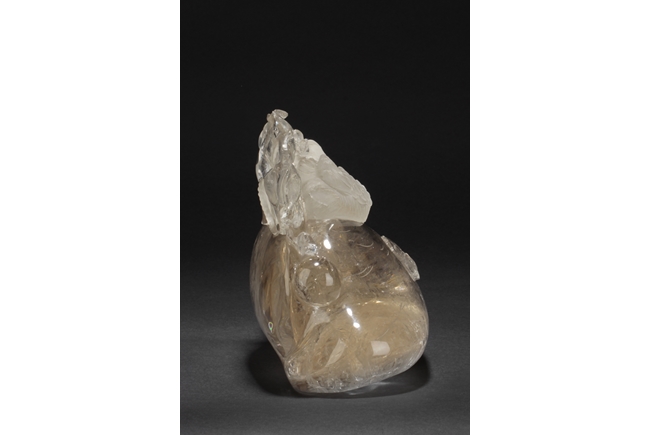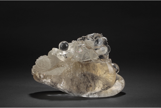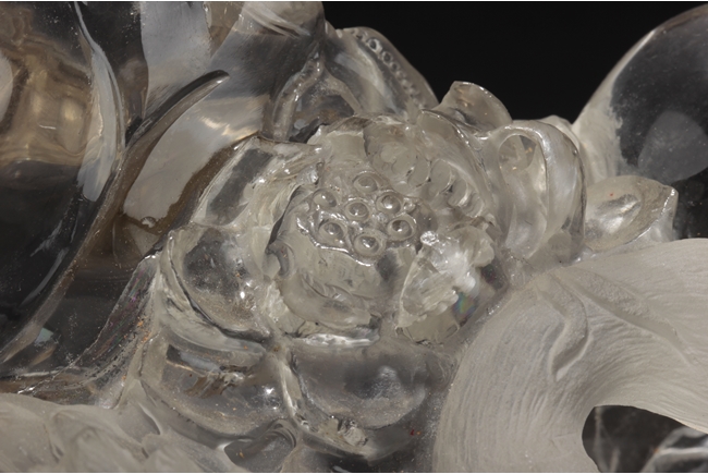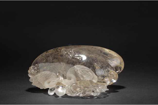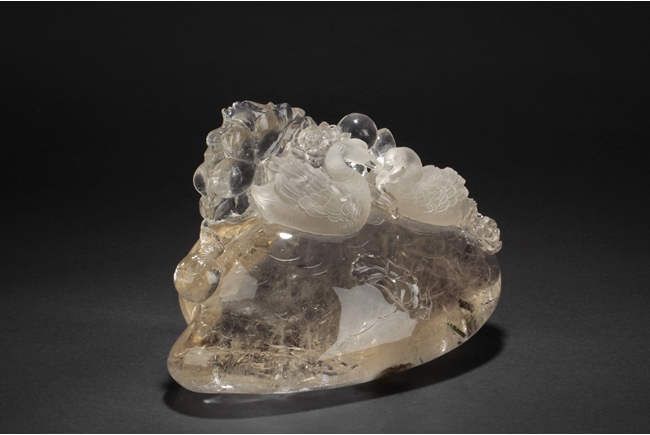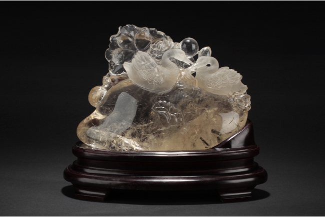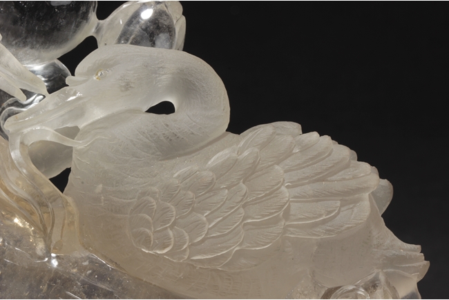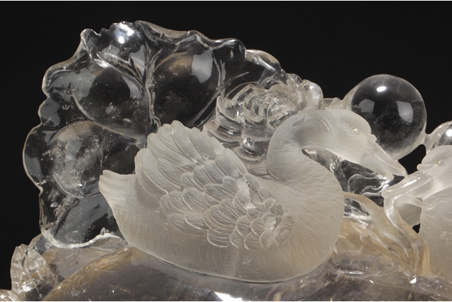 The figural group depicts a pair of swans swimming in a lake, surrounded by lotus leaves, lotus flowers, and lotus pods; the crystals forming the lake and lotus flowers are more transparent than the crystals forming the swans, and has some natural inclusions at bottom. 19th century.