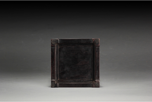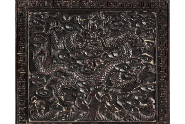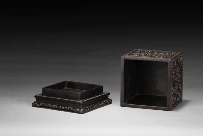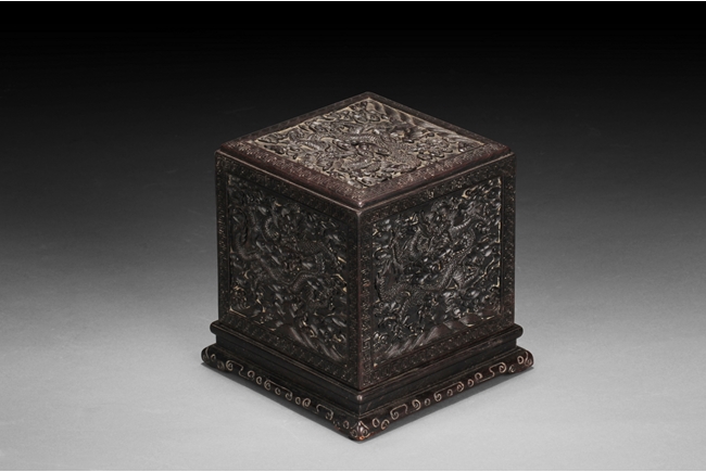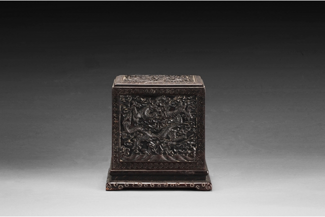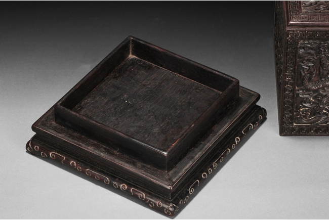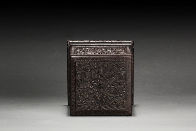 Of square form, the box carved with a five-claw dragon amidst clouds on top and four sides, each edge with scrolling key-fret patterns, bottom remain uncarved. The box retains original Zitan wood color and grains. 19th century.