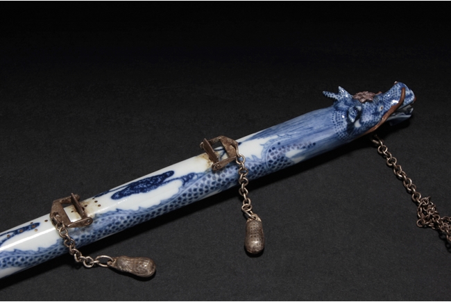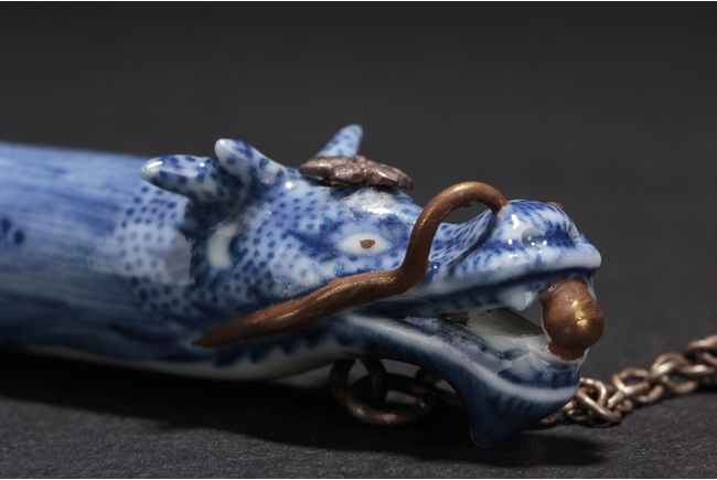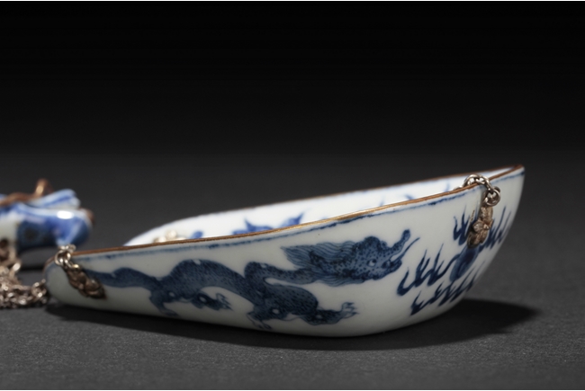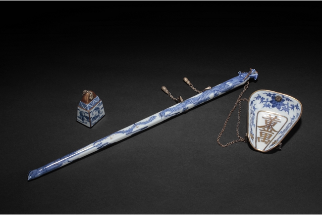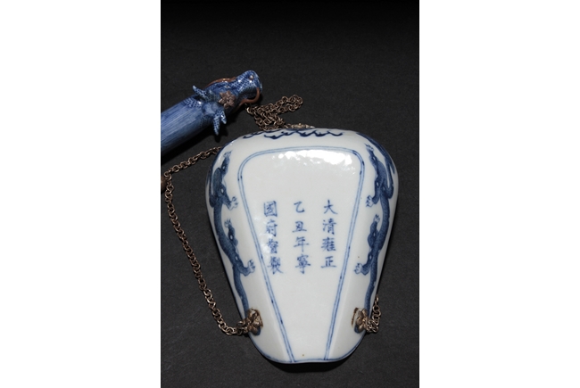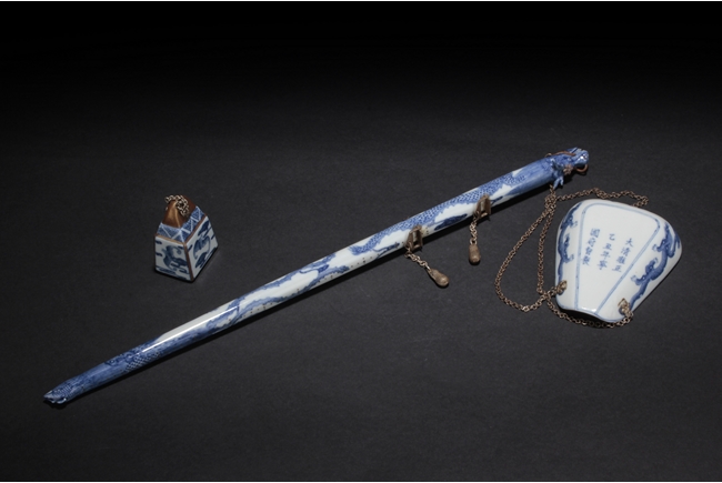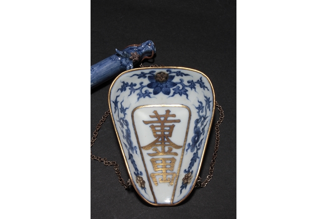 The balance beam depicts a flying dragon and a phoenix, with the heads forming the two ends, the weight depict flying bats amongst clouds, and the plate with Chinese characters surrounded by lotus and vine patterns, the reverse with Chinese verses. Late Qing Dynasty period.