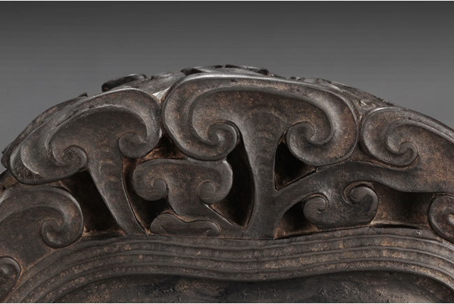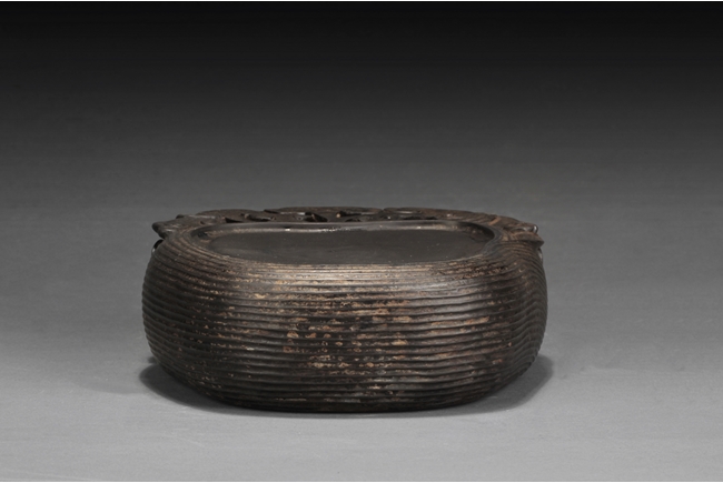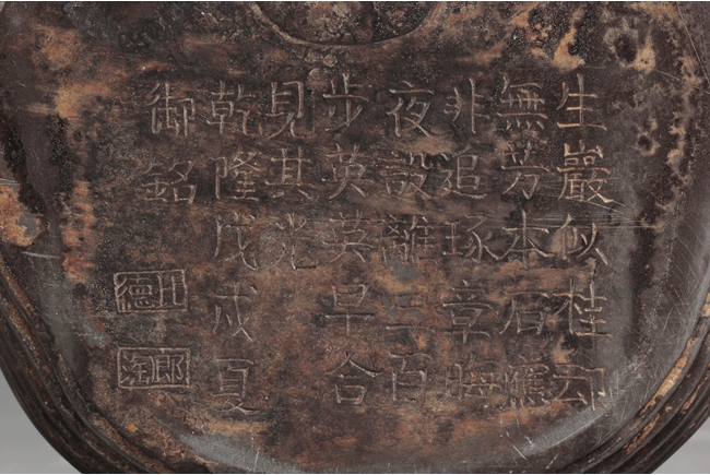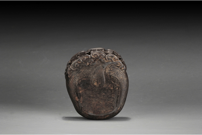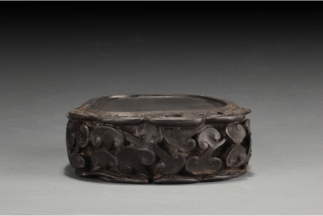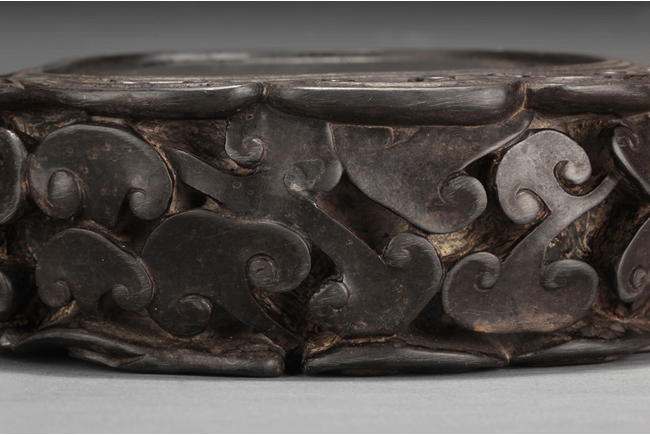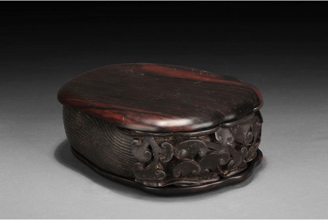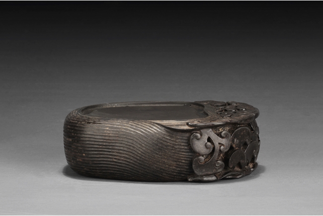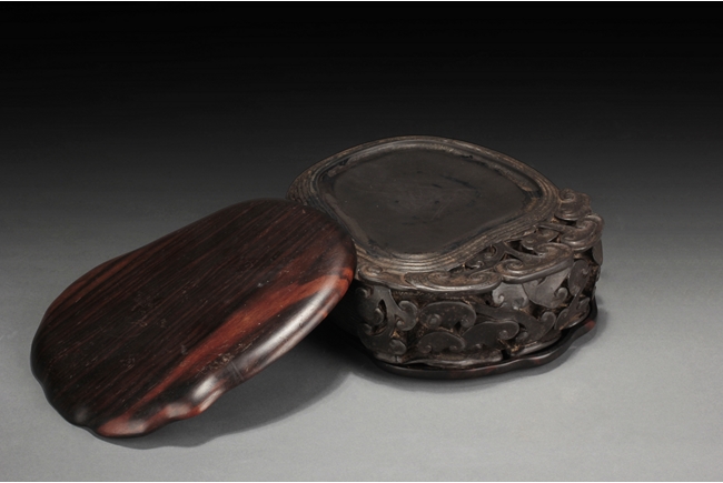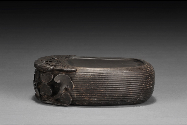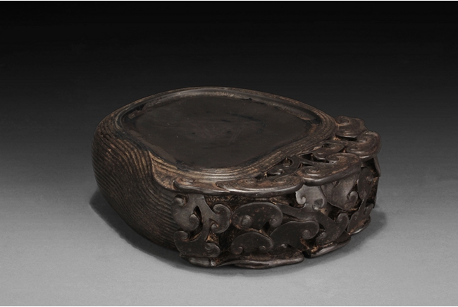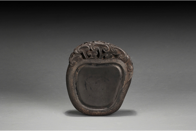 The inkstone high relief carved with lingzhi on the top and sides, the reverse carved with Chinese poem and artist marks. 19th century.