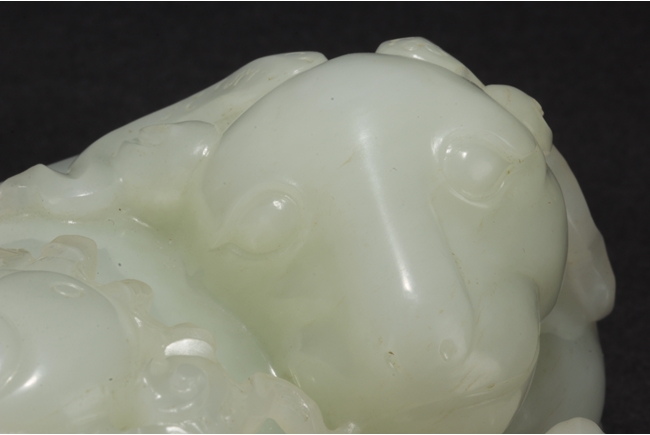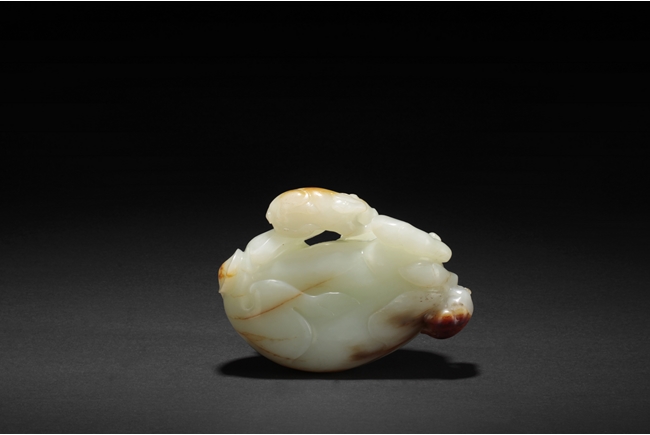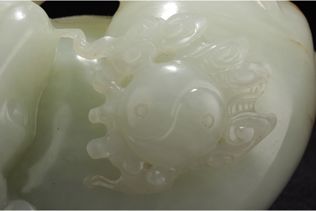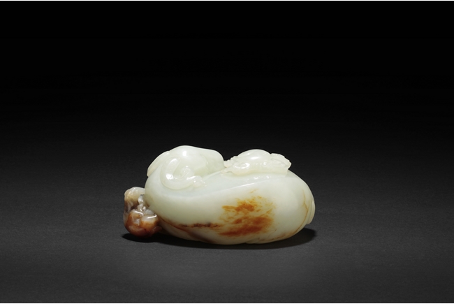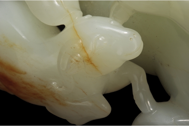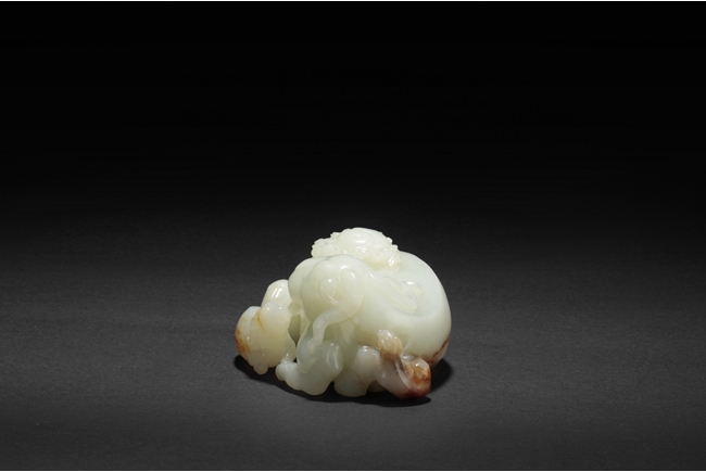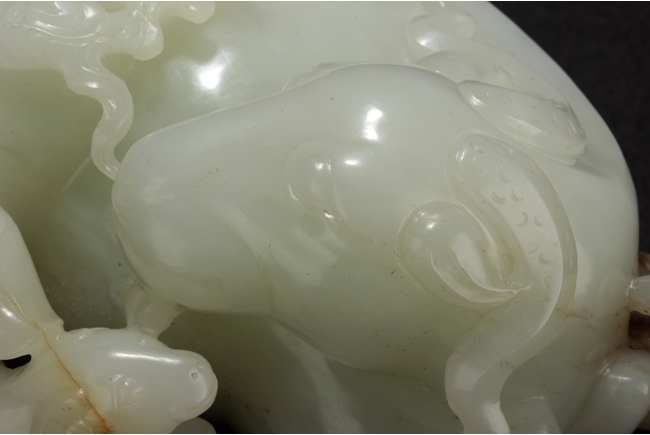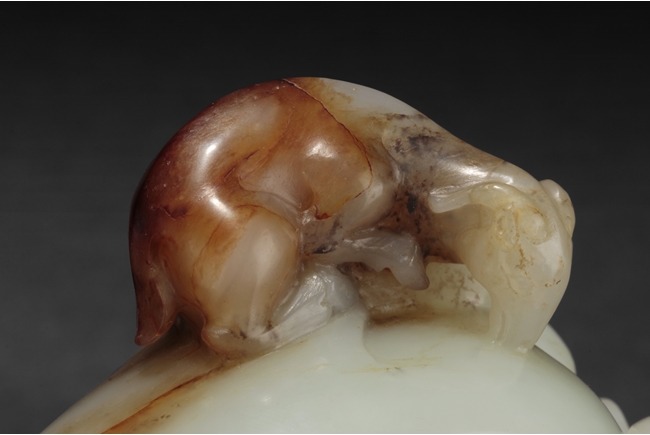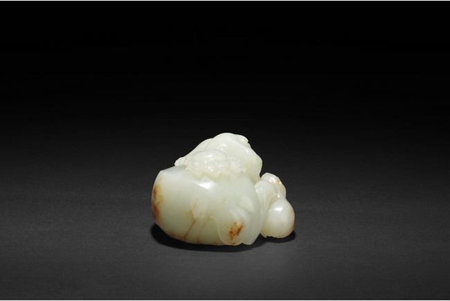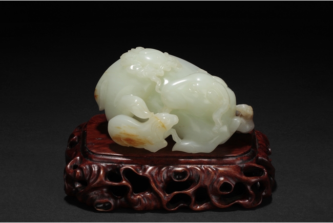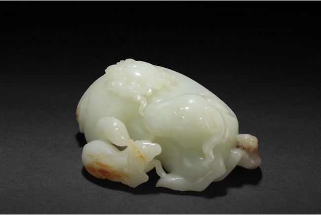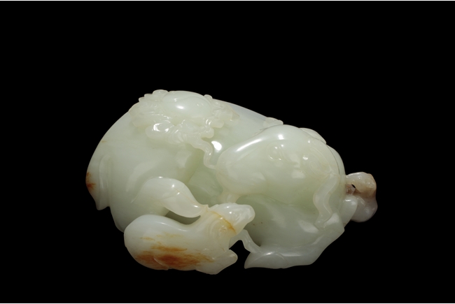 The carving depicts a large goat with two baby goats playfully by its side, the large goat bites onto a Yinyang symbol's group of lingzhi on the side, the stone of white with russet patches cleverly carved. Qing Dynasty period.