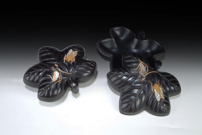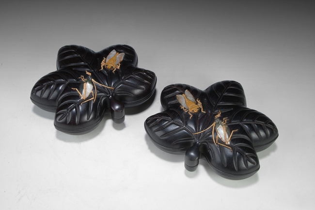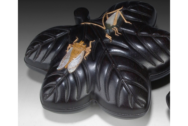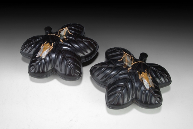 A pair of Zitan carved cover boxes in the form of maple leaves, and each embossed with two insects, constructed of abalone shell, jade, and shoushan stone. 19th century.