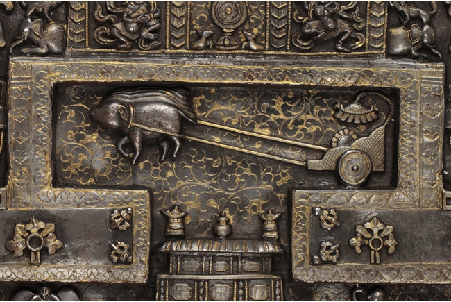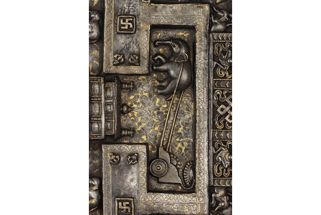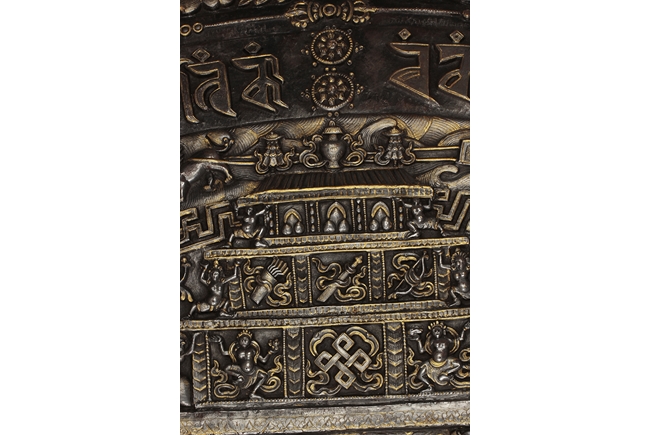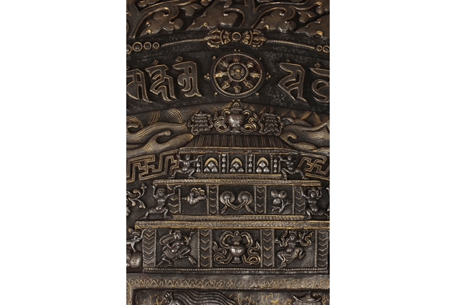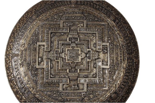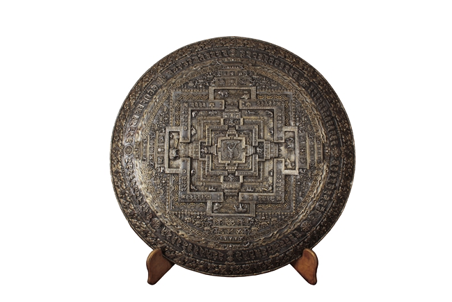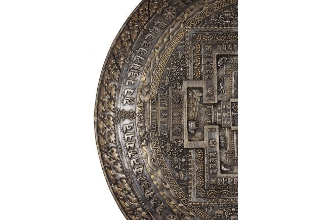 Of round form, the mandala was masterfully worked in silver and gilt silver to depict a central deity Cakrasamvara Tantra, surrounded by three layers of four gates, in between the gates include four guardians, animals, and animal carriages, all against a ground of silver filigree scroll-work; the copper base sealed to the reverse. Qing Dynasty period.