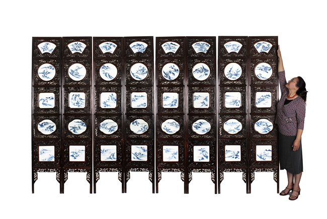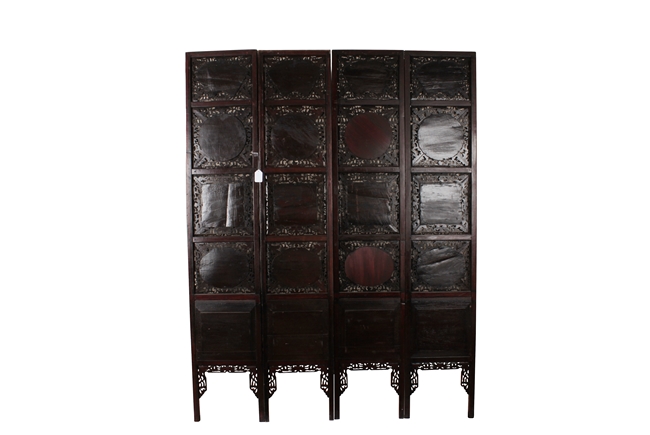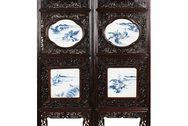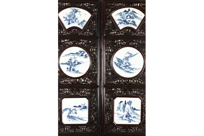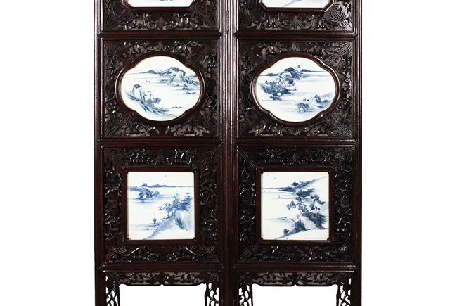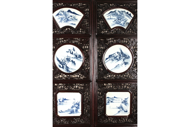 The frames exquisitely pierce carved with flower and vine patterns with gourds in between, each panel inset with four blue and white porcelain plaques, in order of fan, round, square, and concave oval shape, each depicting a different river side and mountain landscape scene. Qing Dynasty period. Provenance: Estate of Thomas Chang of United States