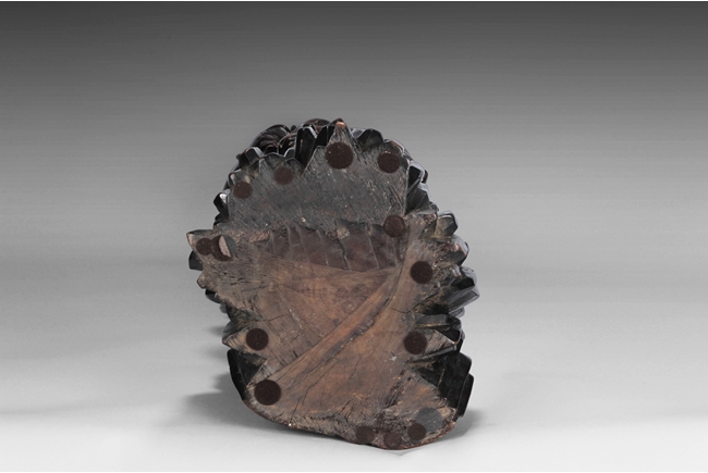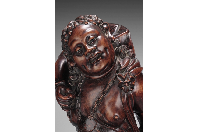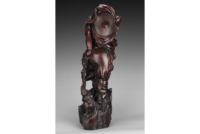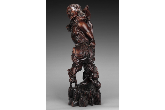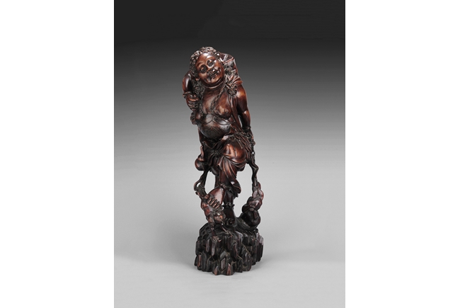 The Immortal Liu Hai's one foot standing on rocks, the other foot standing half-bent on a small mythical beast, wearing ragged cloth exposing bare chest, left hand holding a chain with few coins, tempting a frog to bite on it, and he is carrying a straw hat on his back. The Longyan wood of natural color and grain. Qing Dynsaty period. Provenance: Estate of Thomas Chang of United States
