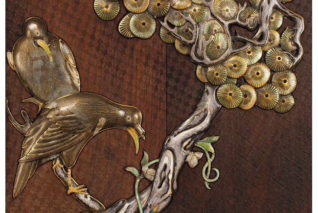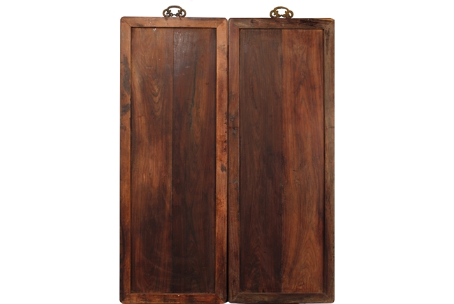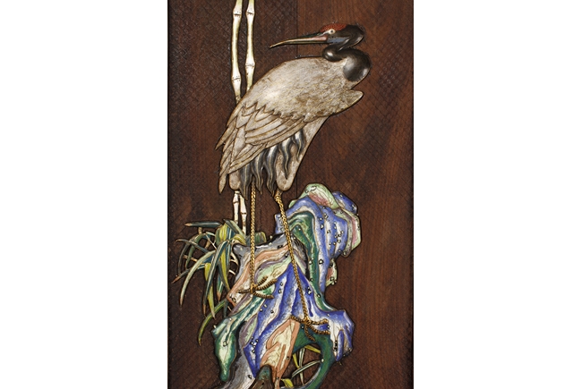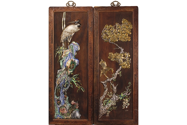 Of rectangular shape, the wooden panels decorated with golden birds, majestic crane, colorful rocks, dense pine tree, and blooming flowers, all with different semi-precious stones, outlined in gilt. Qing Dynasty period.
