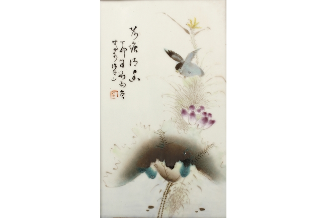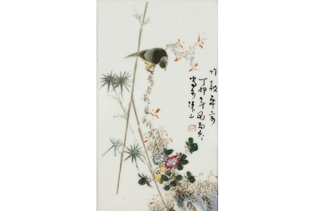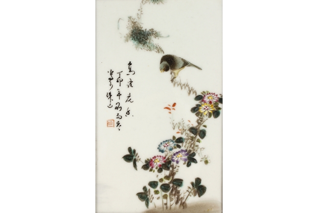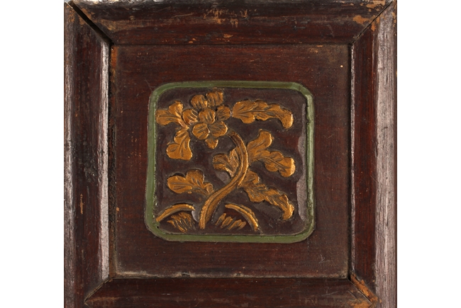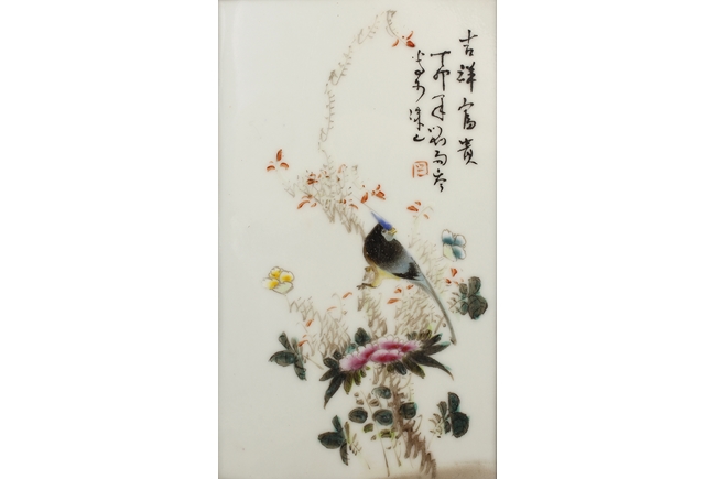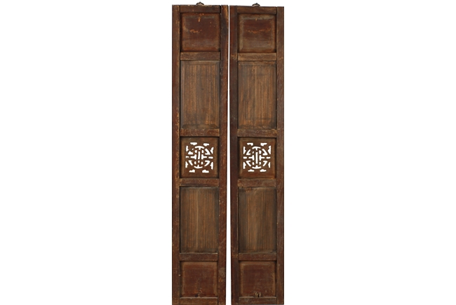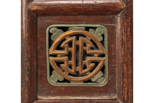 Of long rectangular form, the wooden hanging board decorated with low relief carved flowers on top and bottom, pierce carved circular pattern in middle, and inset with famille rose birds and flowers porcelain plaques in-between. Republic period.