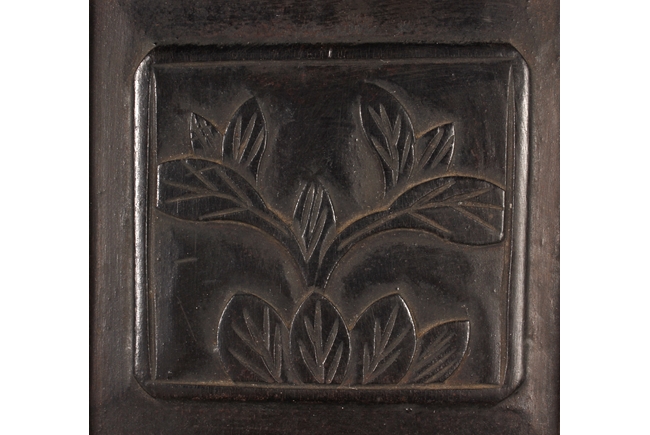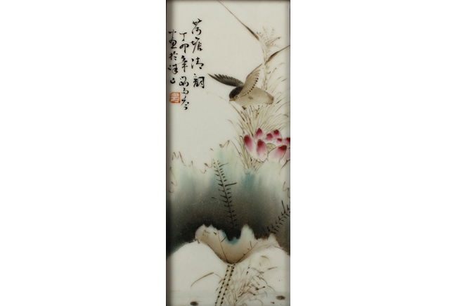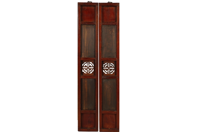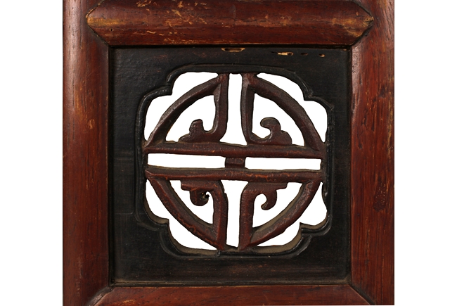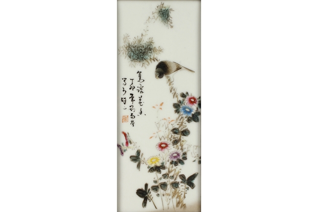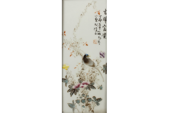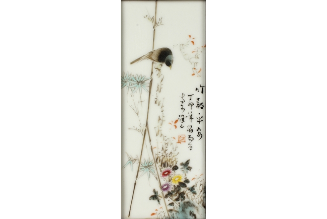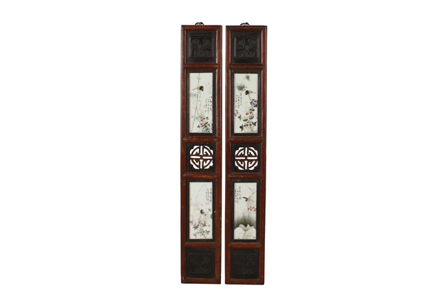 Of long rectangular form, the wooden hanging board decorated with low relief carved flowers on top and bottom, pierce carved circular pattern in middle, and inset with famille rose birds and flowers porcelain plaques in-between. Republic period.