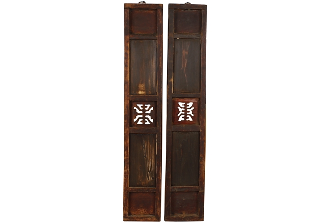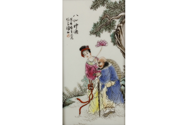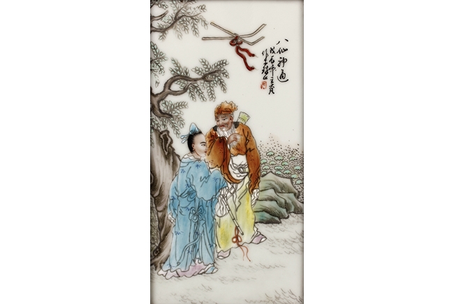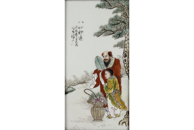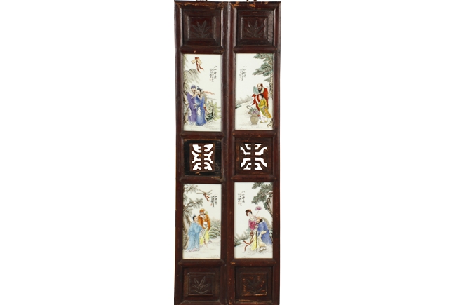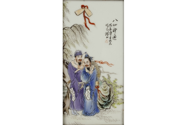 Of long rectangular form, each wooden hanging board inset with two famille rose porcelain plaques, depicting the Eight Immortals near the ocean, all with artist signature and mark. Republic period.