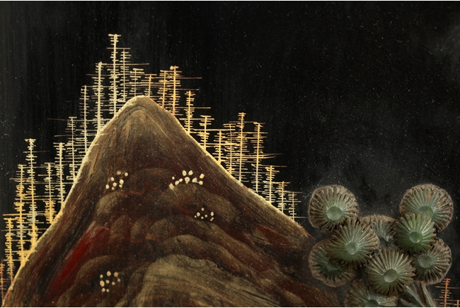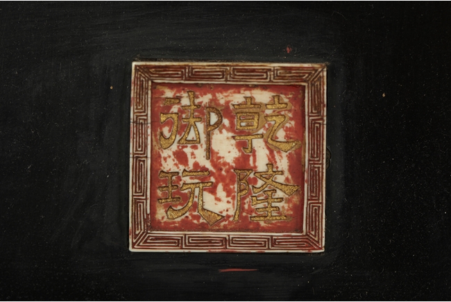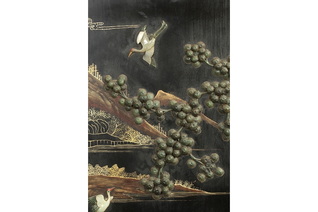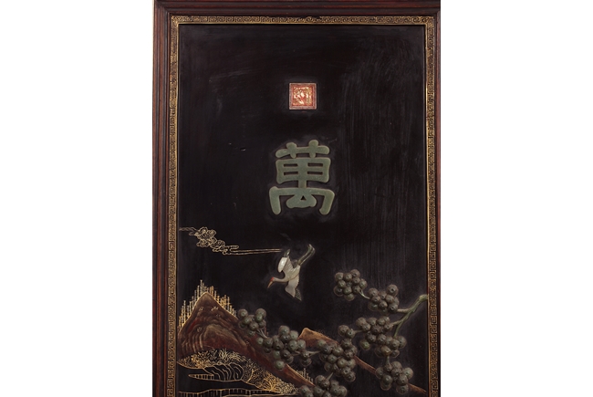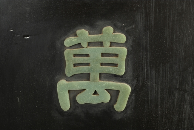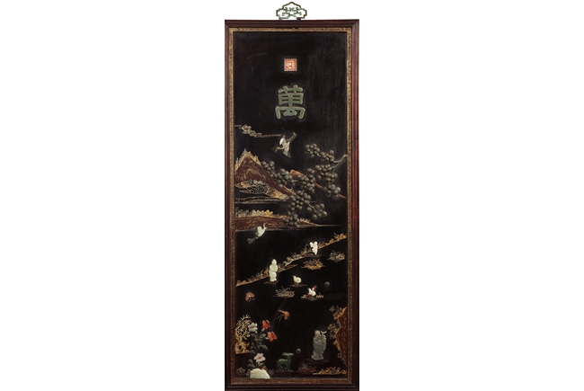 Of vertical rectangular form, the plaque depicts a scene of tall mountains, flying cranes, walking people, and blooming flowers, all made with white jade, spinach jade, agate, and other semi-precious materials, with a jade Chinese character "Shou" in the top center, and four character "QIANLONG" mark on top, all against black lacquer with gold lining, and edges with key-fret pattern. Qing Dynasty period.