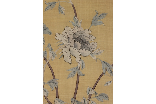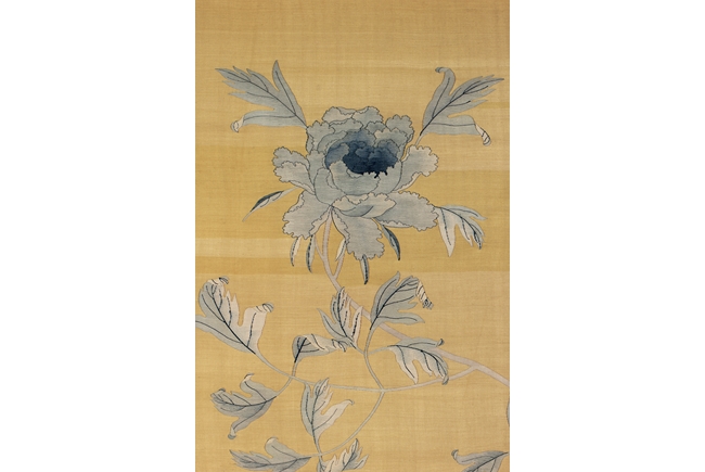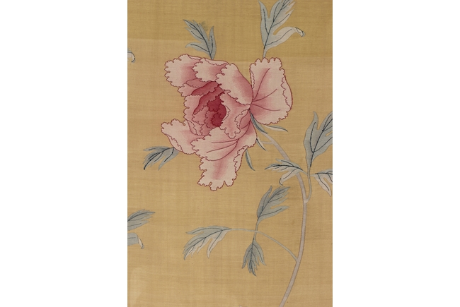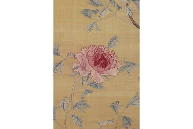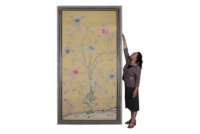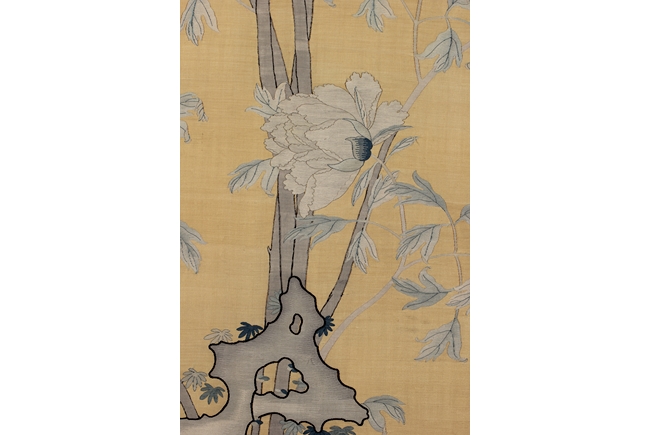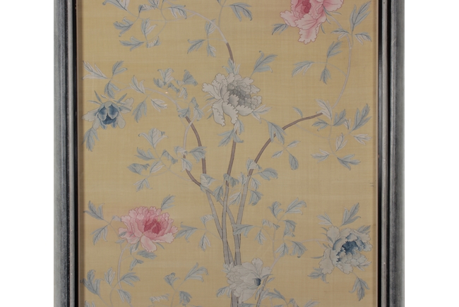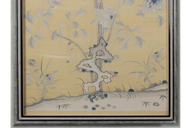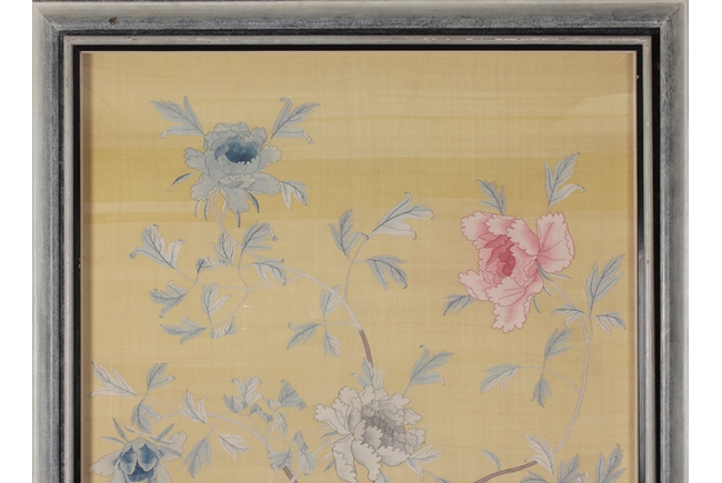 The large framed Kesi panel depicts blossoming peony flowers of pink, white, and blue, spread among five main branches and many flowers, against yellow background. 18th century. Provenance: Estate of Thomas Chang of United States