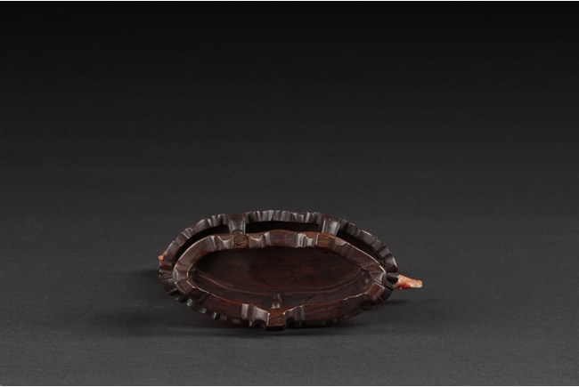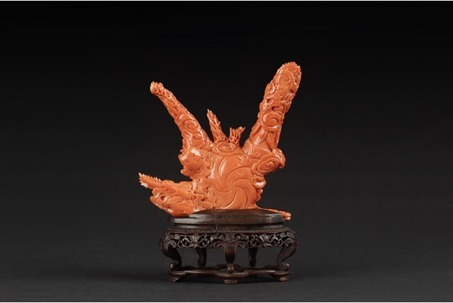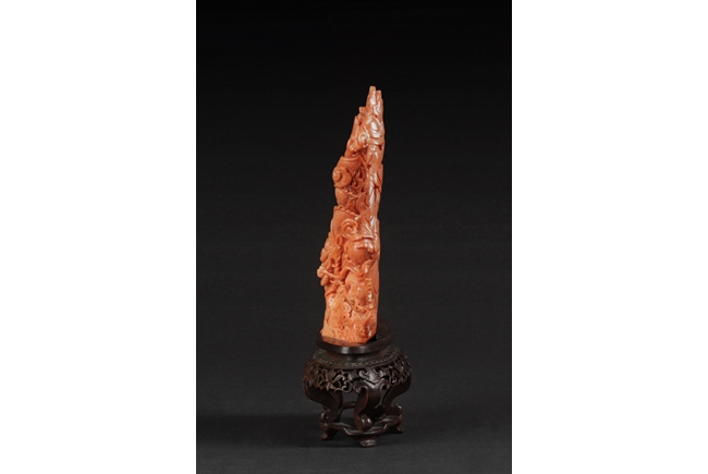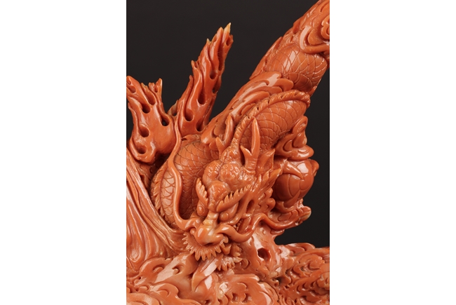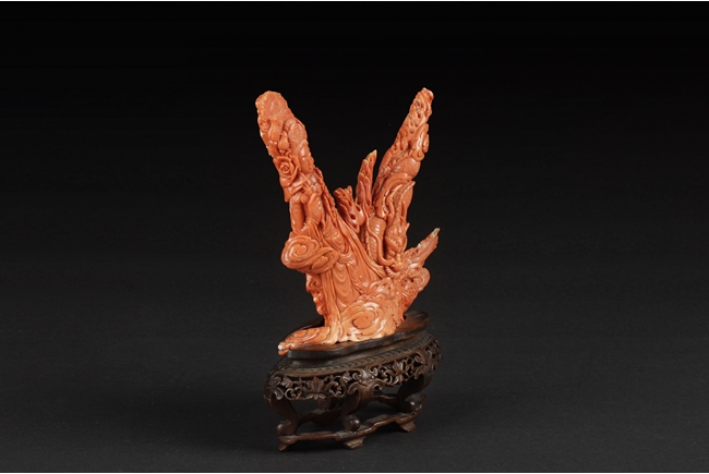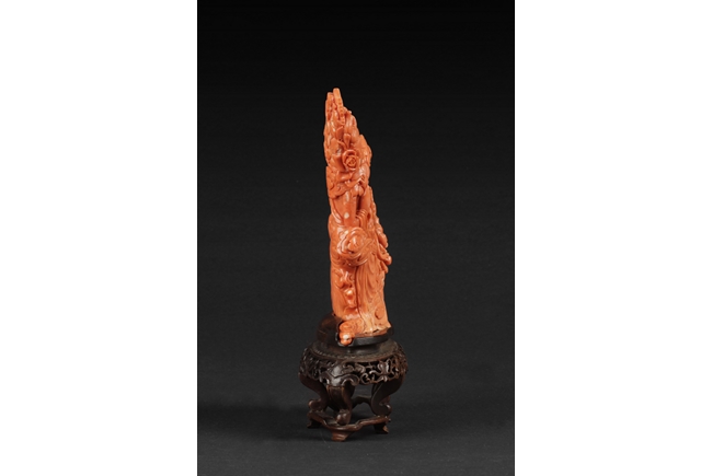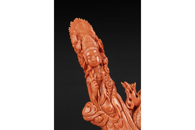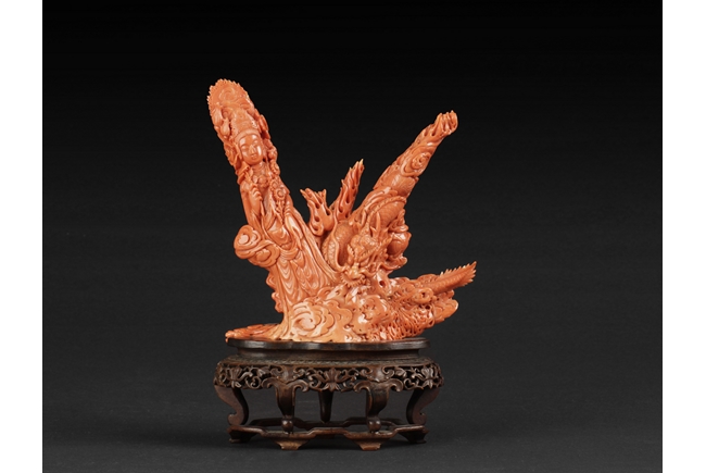 Leaning sideways, the Guanyin is holding lingzhi in one hand, flowers in the other, dressed in flowing robes and ornate crown, she flies amidst clouds next to a fierce dragon, the body and claws mostly hidden within fire and clouds. The figural group is attached to its original pierce carved wood stand. Qing Dynasty period. Provenance: Estate of Thomas Chang of United States