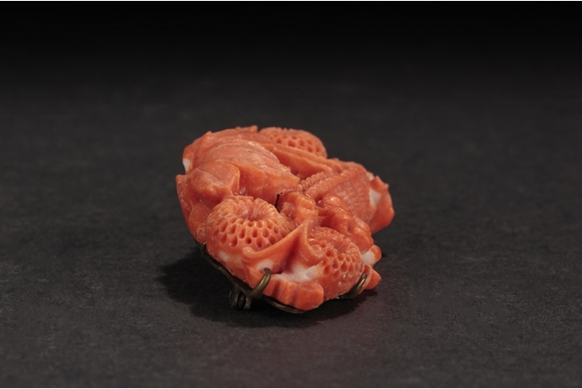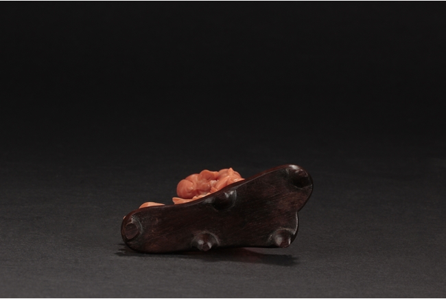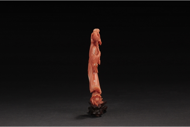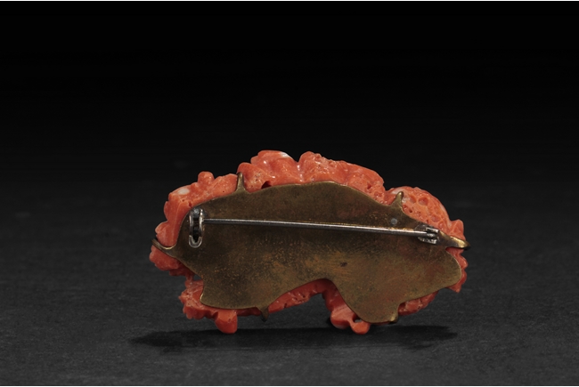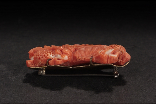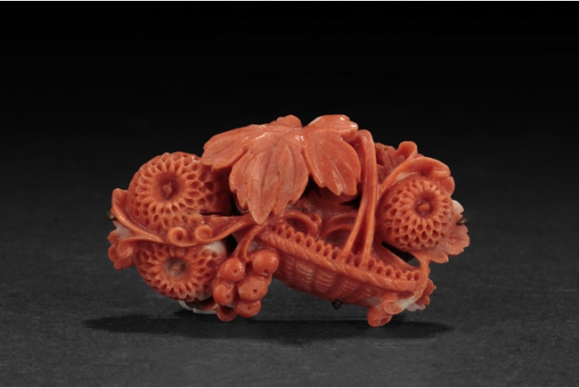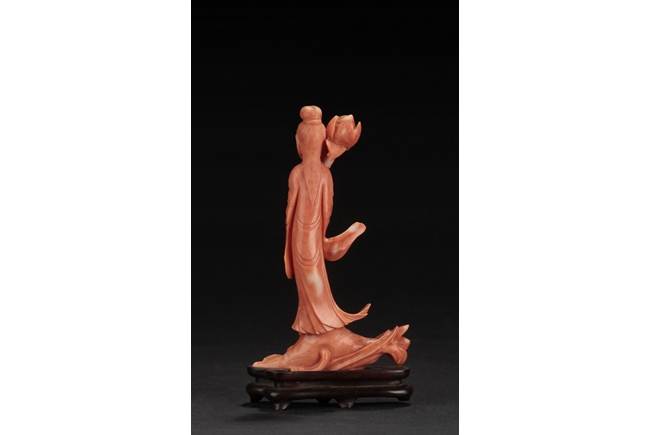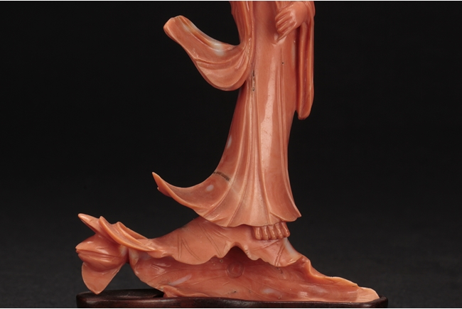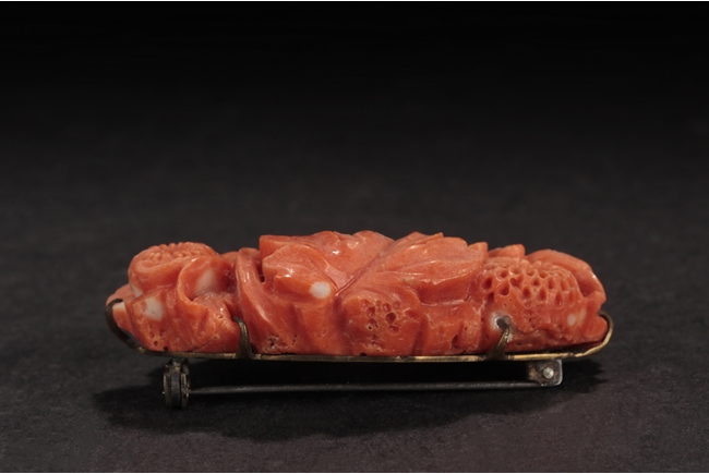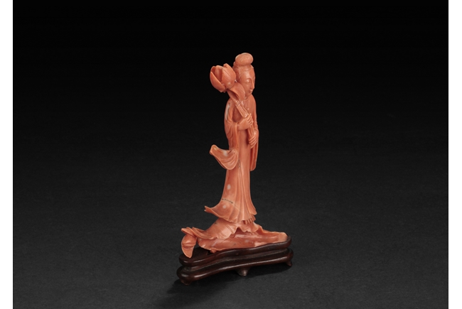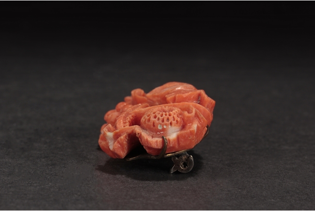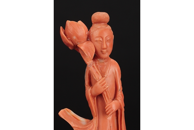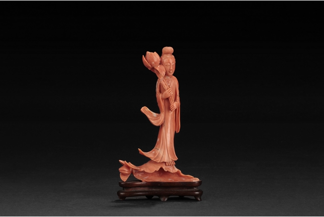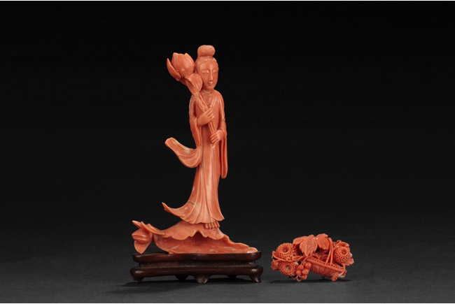 The coral carving depicts a beauty, wearing flowing robes, is holding a blooming lotus flower, while standing bare feet on top of a lotus leaf. The coral brooch depicts a flower basket full of blooming flowers with leaves. Qing Dynasty period.