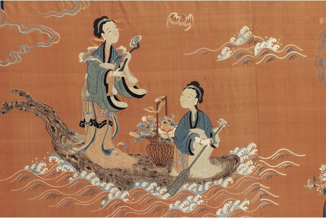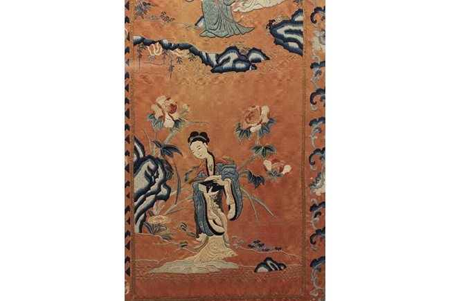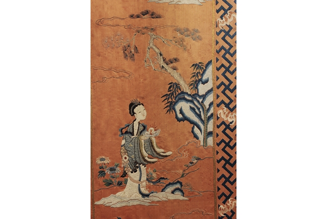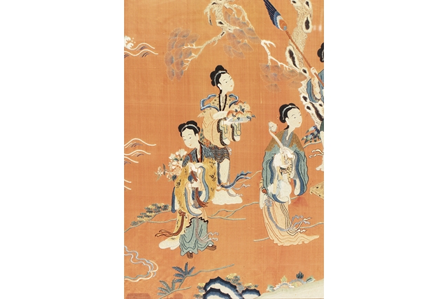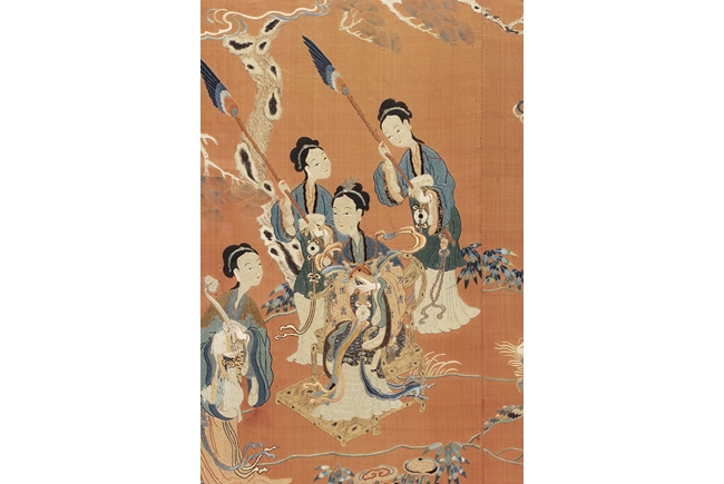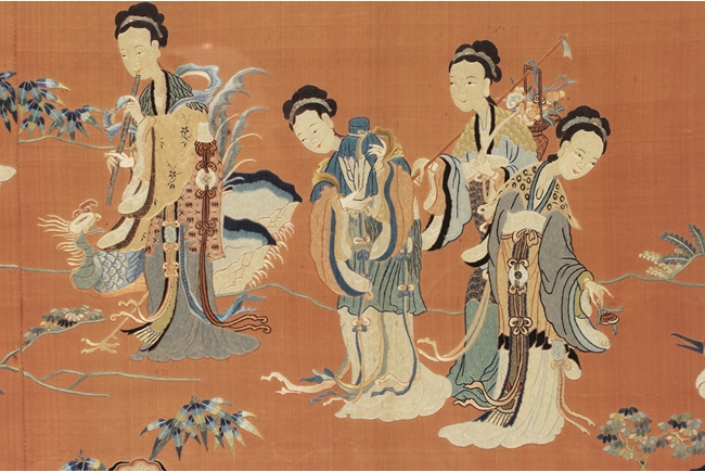 The group consists of three Su silk embroidery panels. The horizontal panel depicts nine fairy maidens with two attendants celebrating Xi Wangmu (Queen Mother of the West, immortal)'s birthday, each with different gifts, surrounded by auspicious symbols. The two vertical panels depicts ladies of different age in landscape and garden setting, the edges with scrolling flower and vine patterns, and bat patterns. Qing Dynasty period. Provenance: Estate of Thomas Chang of United States