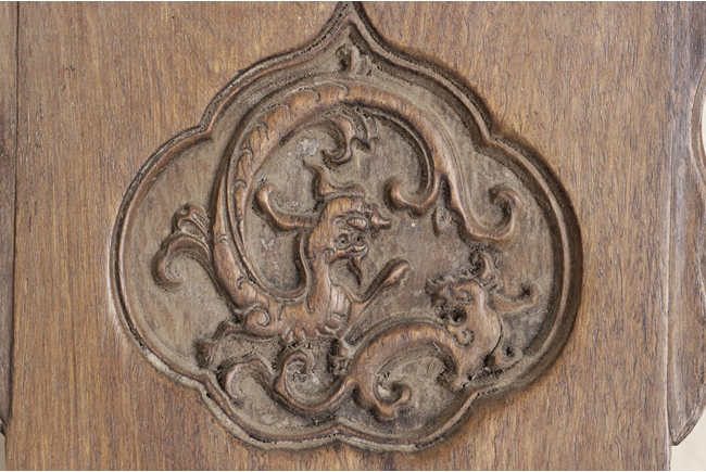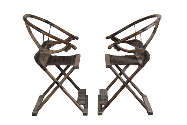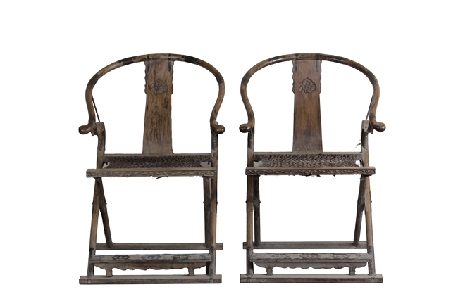 The 'S'-shaped back splats delicately carved with a dragon and a mythical beast design, the curving top-rail supported on the front and back of side posts, the horseshoe terminating in rounded outward hooks, the threaded seat on rounded legs designed for easy folding, with stretchers on the front and back legs. The wood may be Huanghuali. Qing Dynasty period.Collector Mr. Tian, Thailand