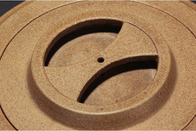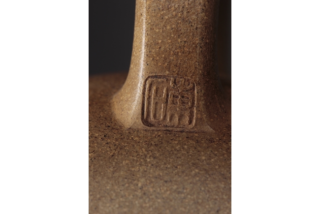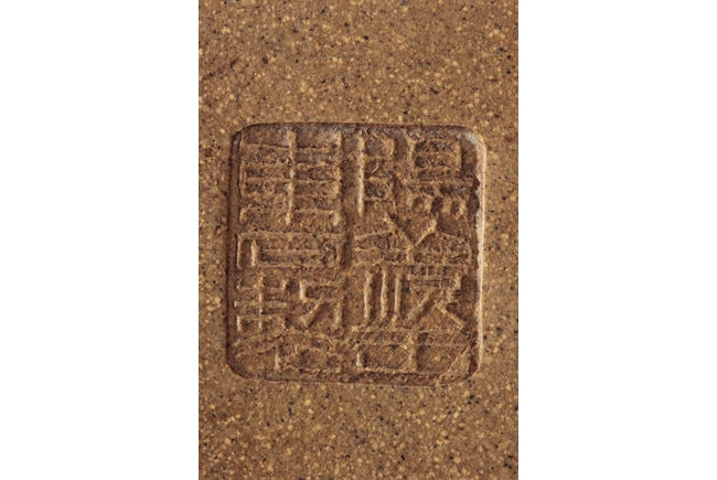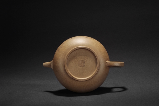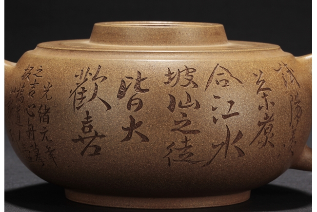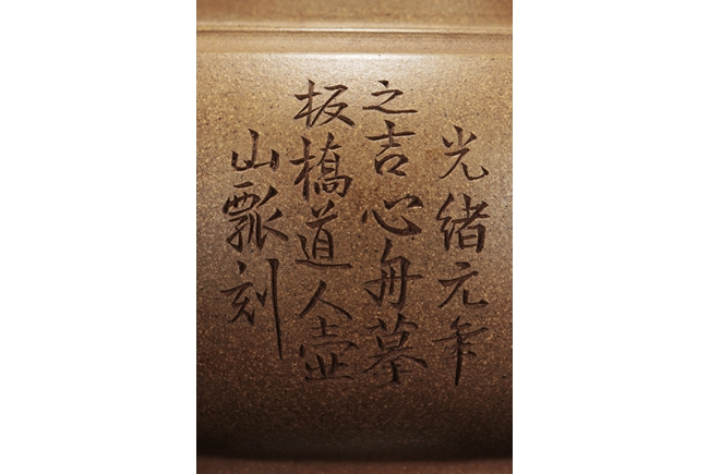 此壺壺身,壺把,壺嘴連成一線,壺蓋似隆起的牛鼻,圓鼓腹,圓圈足,壺身刻有"試陽羨茶煮合江水坡仙之徒皆大歡喜光緒元年之吉心舟摹板橋道人壺山瓢刻"。底款"楊羨王東石製" 把款"東石"