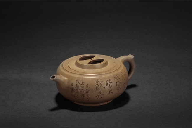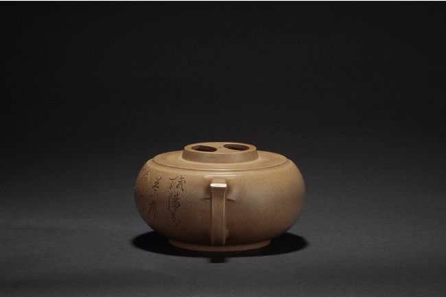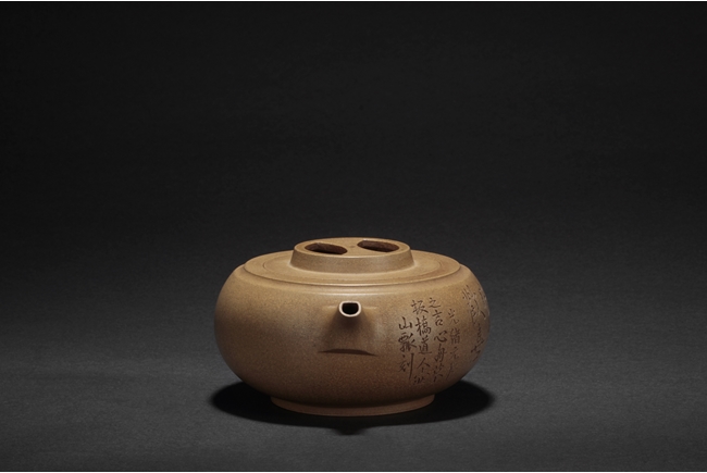 Of compressed globular form, the body carved with Chinese verses and signed by "Ban Qiao Dao Ren" and supported by a ring foot, the finial of buffalo nose shape, and the smooth body surface of light brown. The bottom bears six characters "Wang Dongshi" artist mark, and two character "Dongshi" mark on the handle.