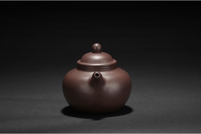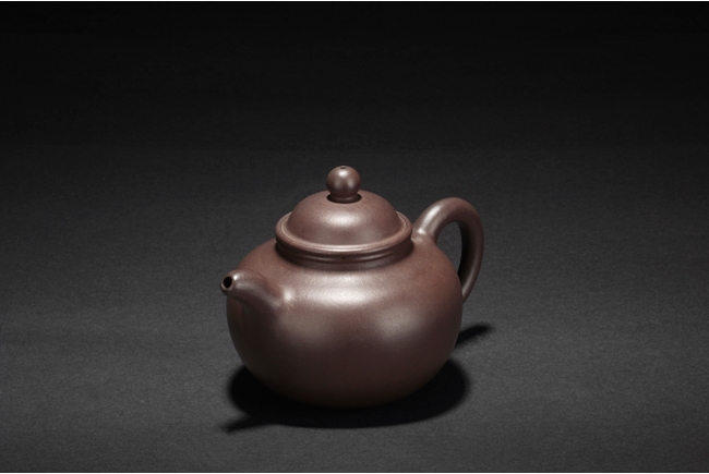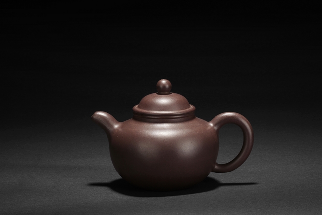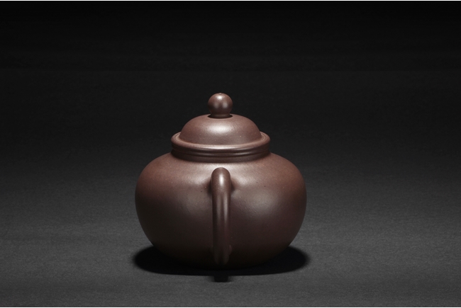 The teapot overall shape of three balls stacked together, from large body to medium lid and small finial, the uncarved smooth body of deep purple-brown color, and a two character "Da Heng" artist mark beneath the lid.