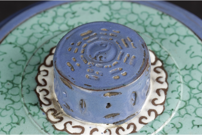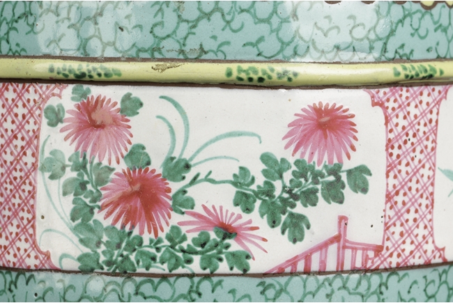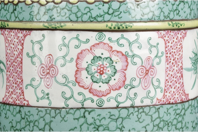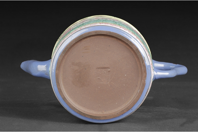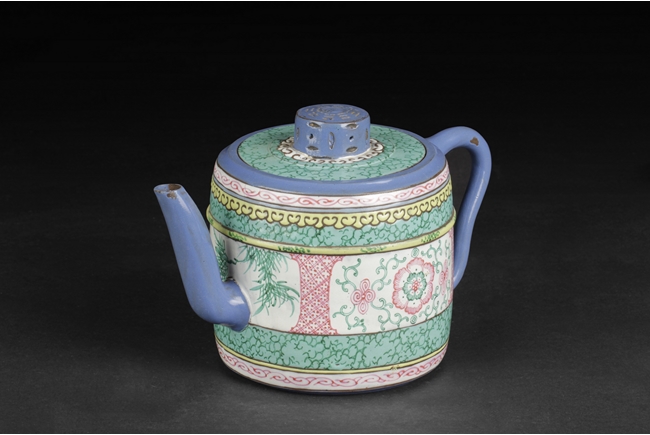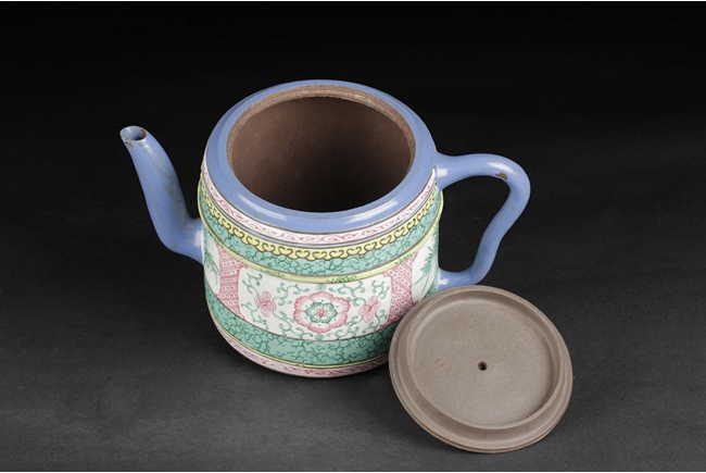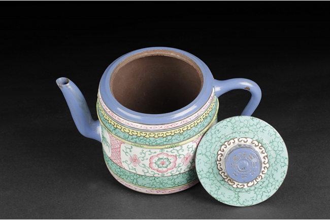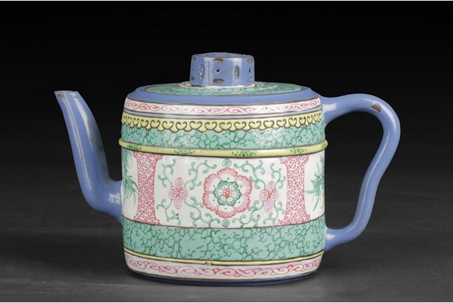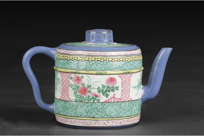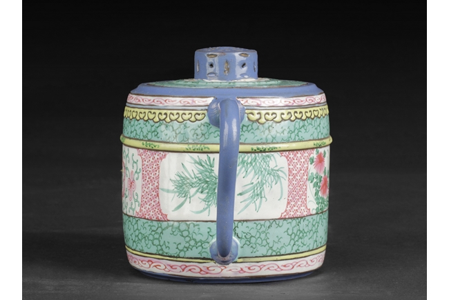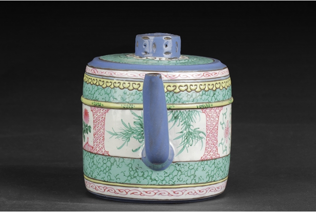Of cylindrical form, the body separated into four painted medallions, one side with peony flowers and vines, the other side with chrysanthemum flowers and leaves, while the medallion near handle and spout depicts dense foliage, all between scrolling band patterns, the finial with a complete Bagua Taichi pattern; the body mostly with green ground, the spout, handle, rim, and finial in blue ground. Bottom bears artist seal mark. 18th century.