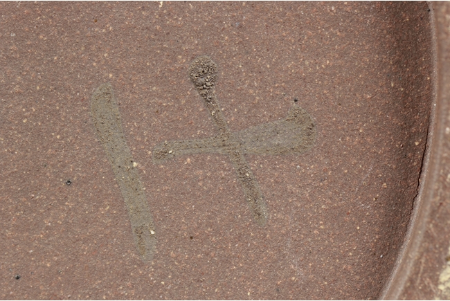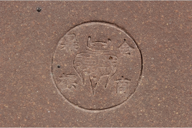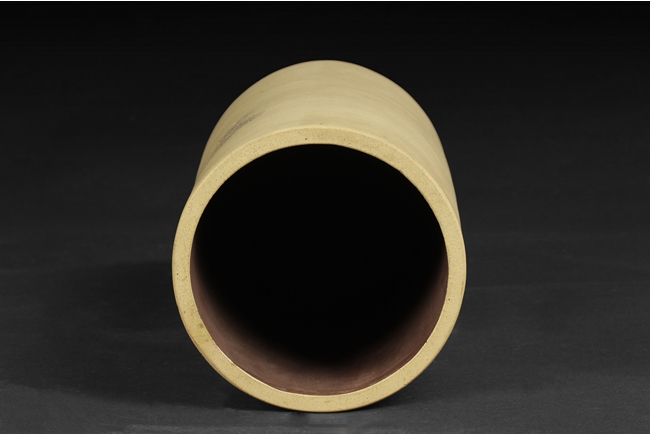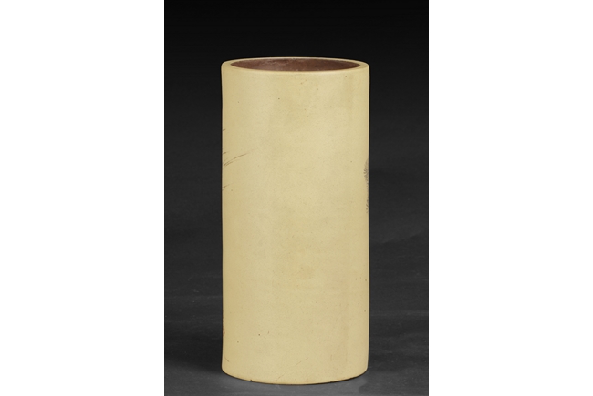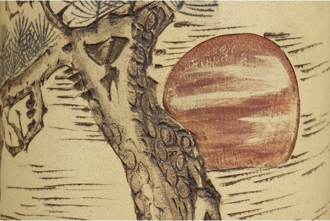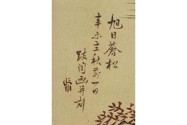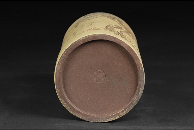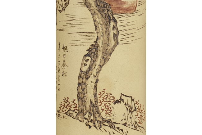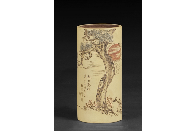 Of long cylindrical form, the brush pot's exterior depict a well-grown pine tree under the rising sun, the side with Chinese verses, artist signature and mark, the bottom with a round four character "Jin Ding Shang Biao" mark.