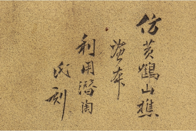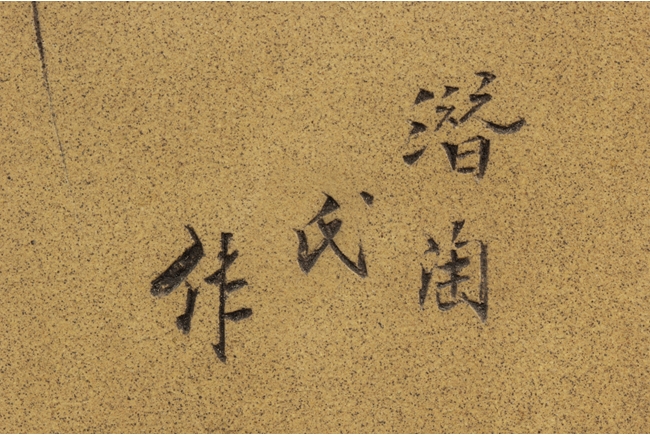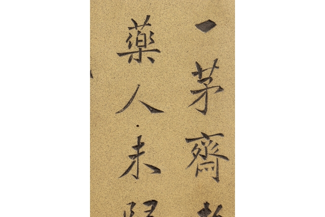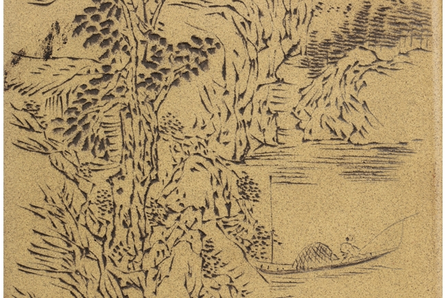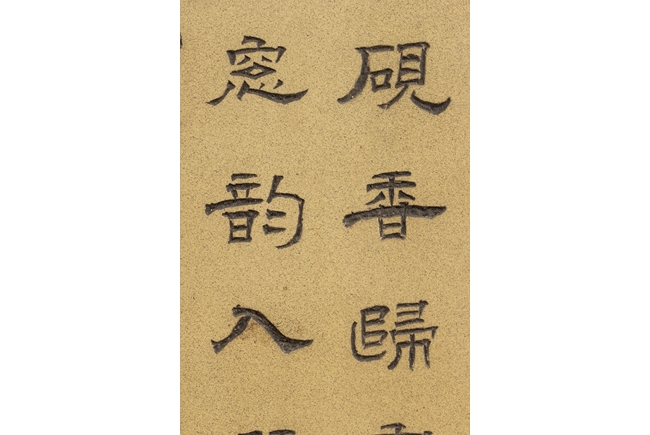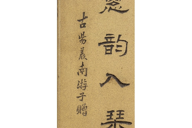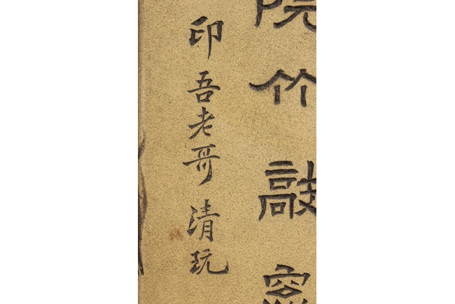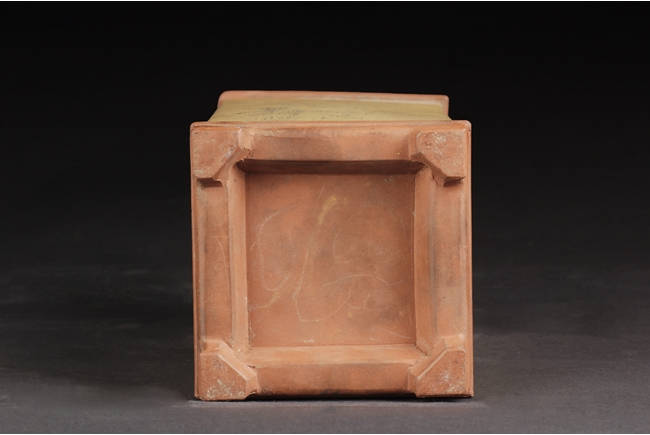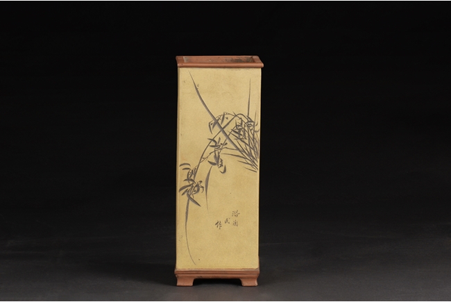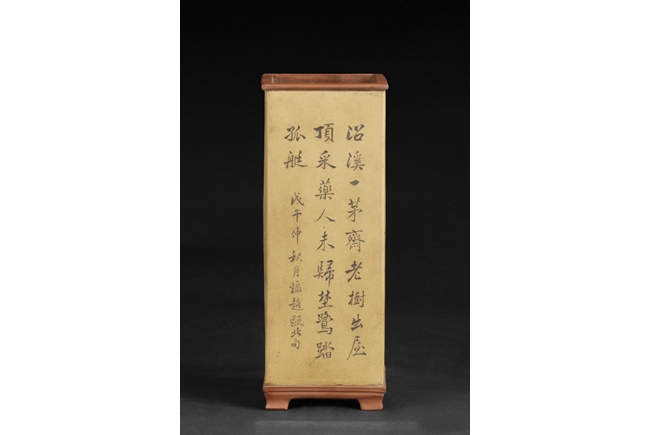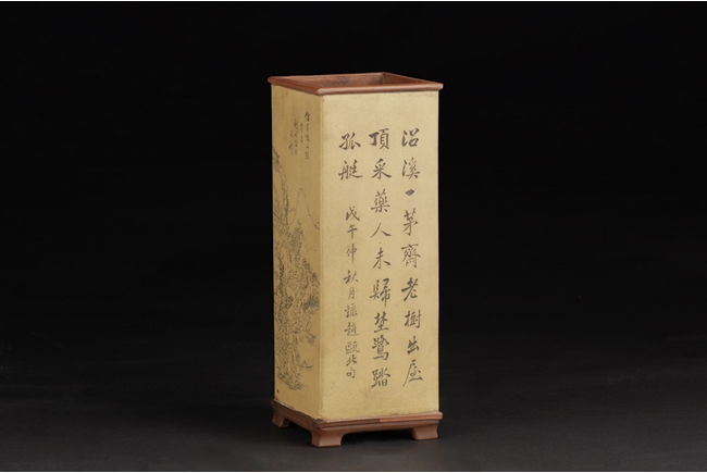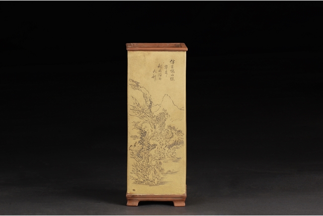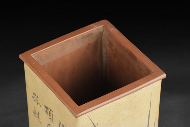 Of long rectangular form, the brush pot supported by four short legs on the edge, the exterior with scenes of mountain, bamboo, and two poems, artist mark "Qian Tao Shi".