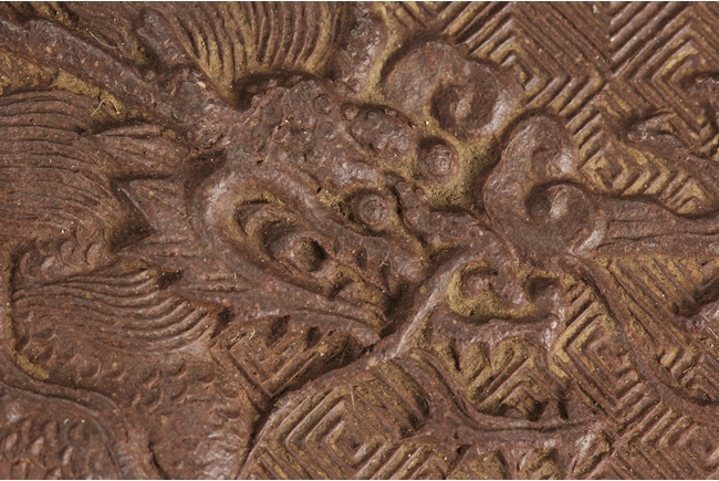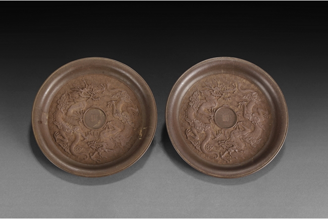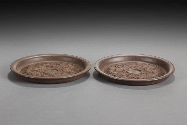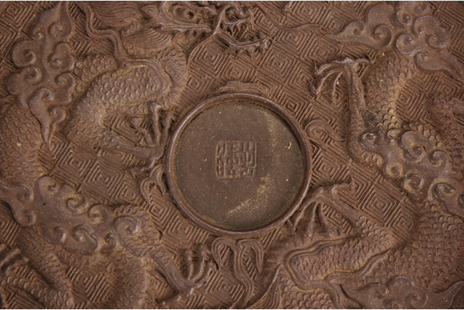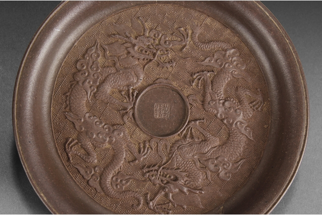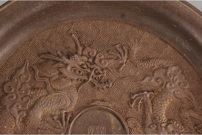 Of perfect round form, the plate's surface depict two four-claw dragons flying amidst clouds, chasing after the flaming pearl, against key-fret patterned background, four character "Chen Guanhu" mark within the flaming pearl.