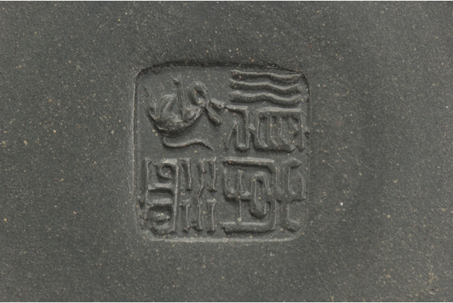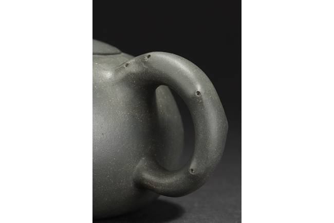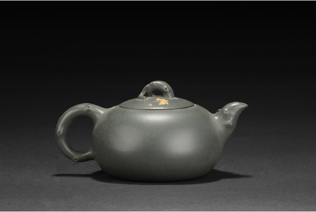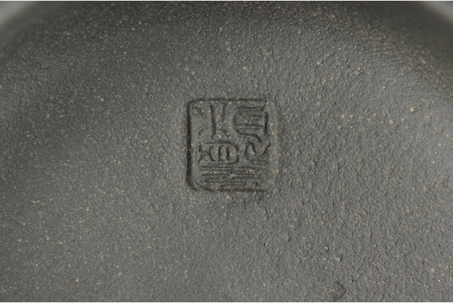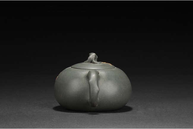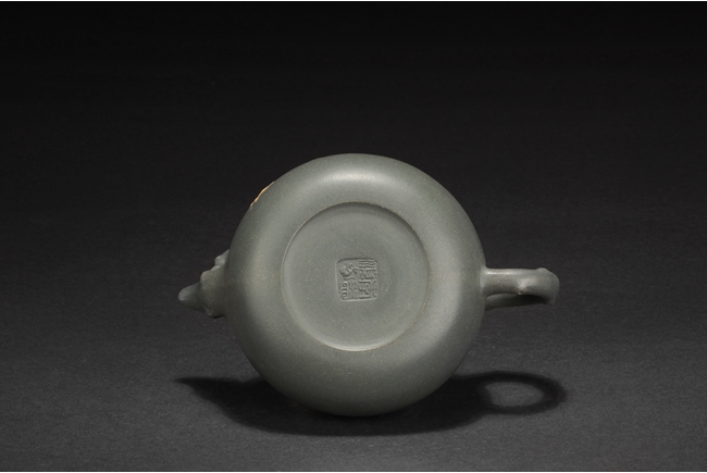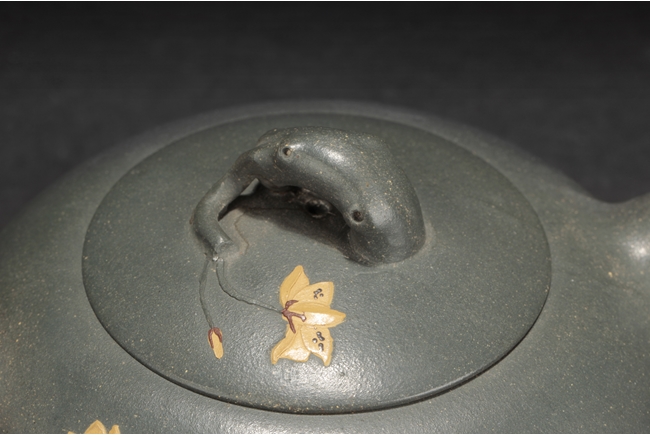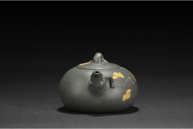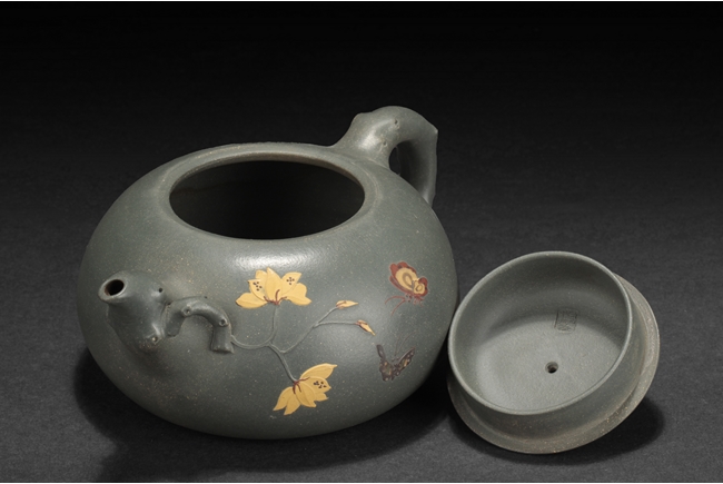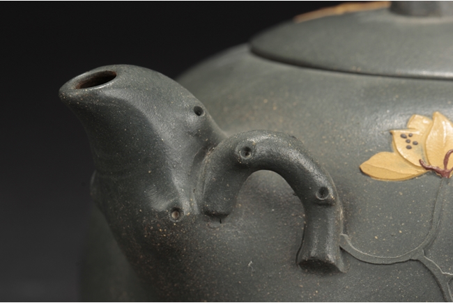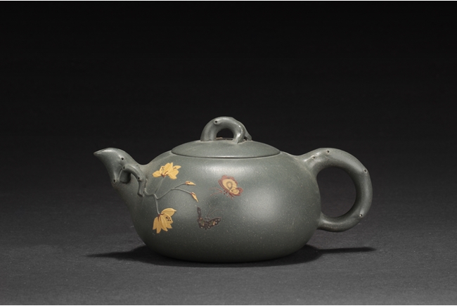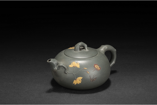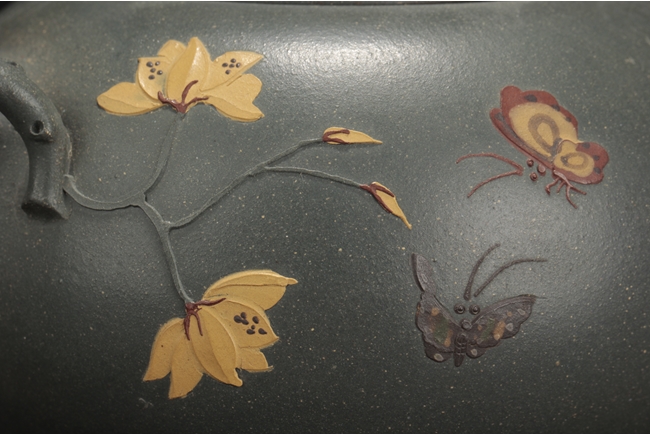 Of compressed globular form, the teapot's exterior depict two butterflies flying next to lotus flowers, with branches turned into spout and handle, the top with similar motif, bottom of lid and bottom of teapot bears artist mark "Ji Yishun".