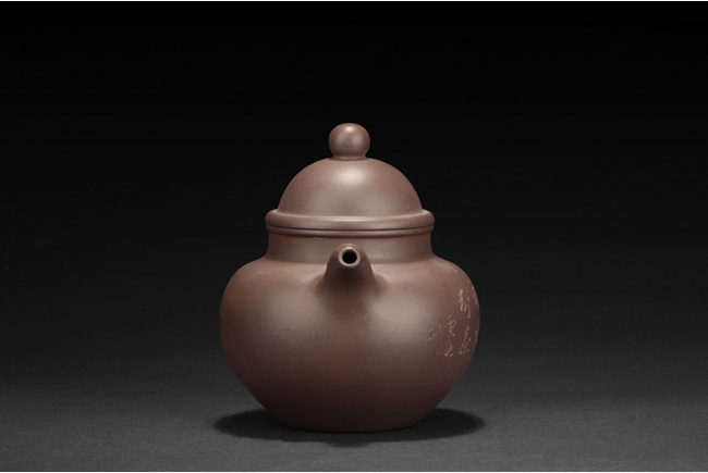 Of pear form, the body inscribed with Chinese verses with artist signature "Cheng Xiuzhen", the domed lid with a round bead-like finial, and bottom with additional Chinese inscription mark.