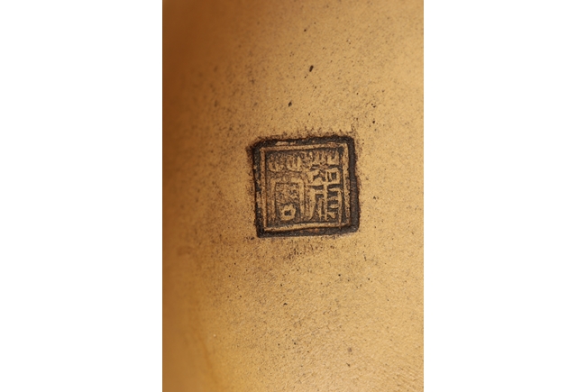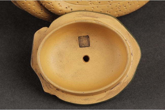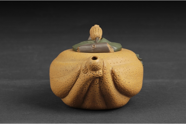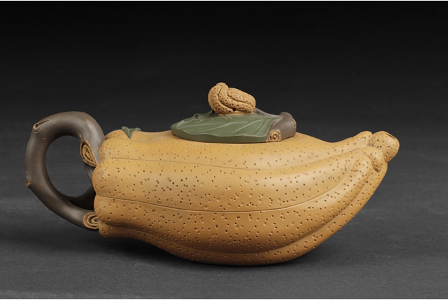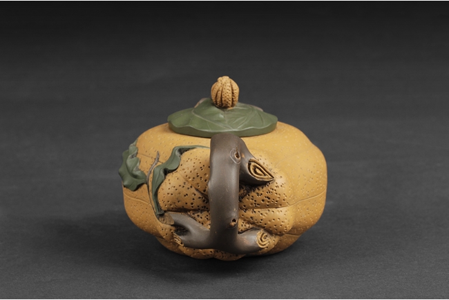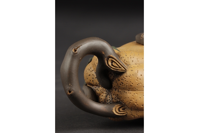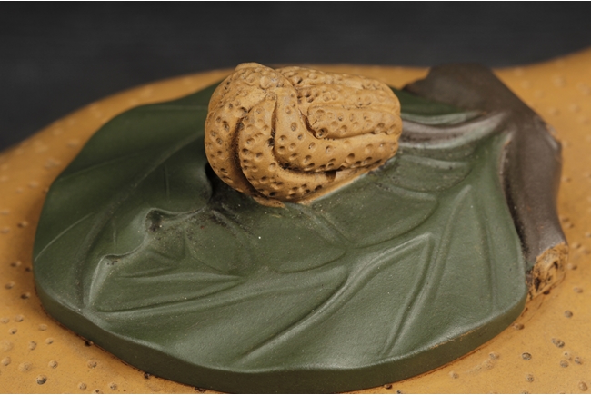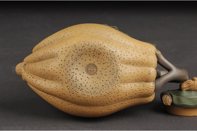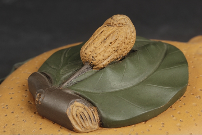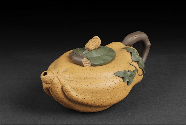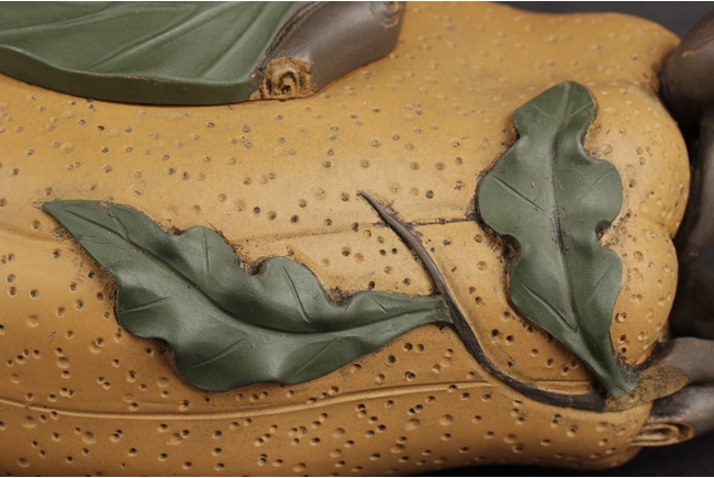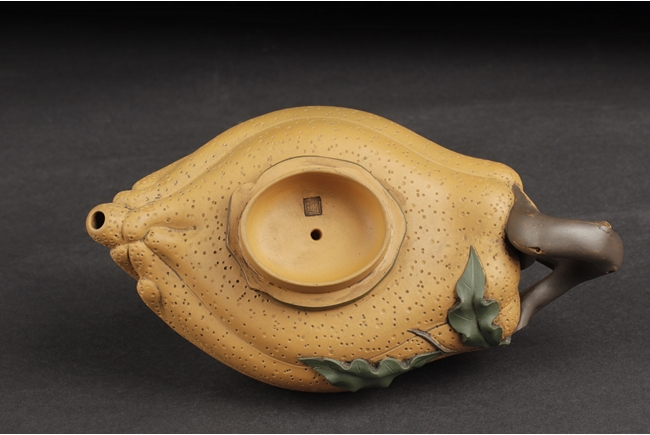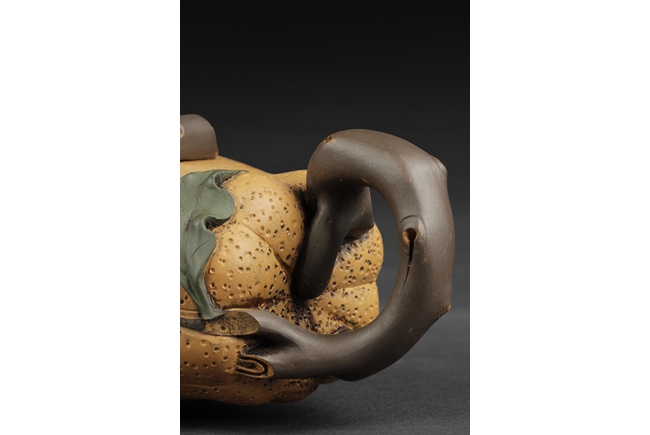 Naturalistically molded into a Buddha's Hand fruit shape, the teapot's body decorated with leaves, the handle resembles the branch, the lid and finial were composed of branch, leaves, and peanut, the bottom of lid and the bottom of teapot with two character "Jiang Rong" mark.