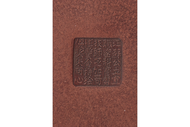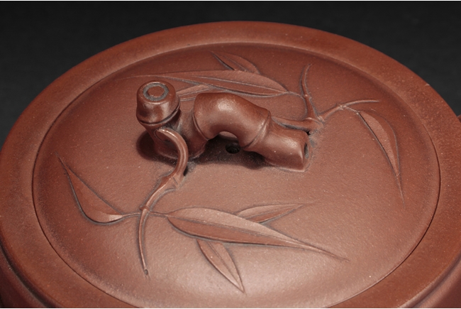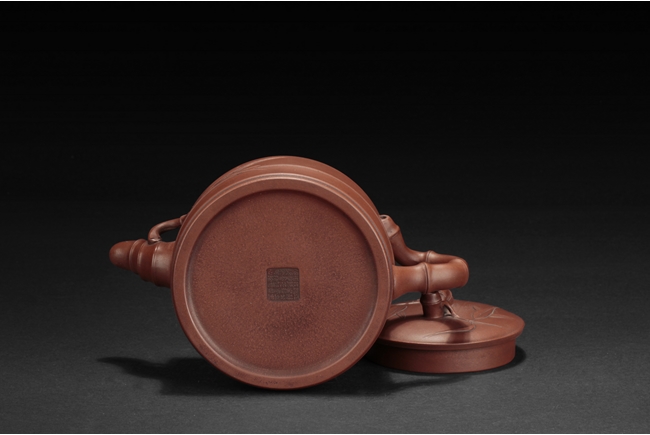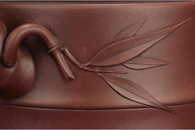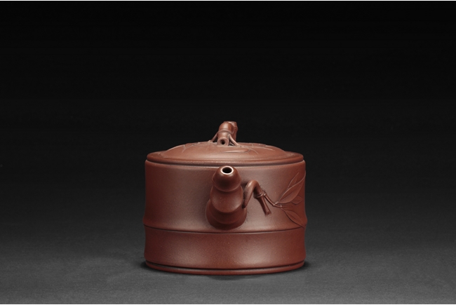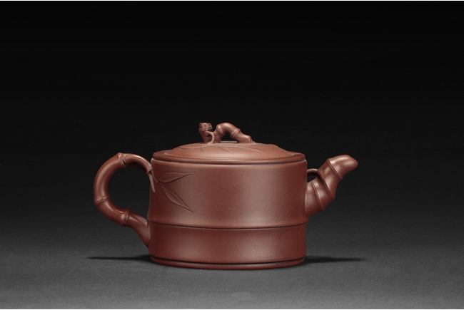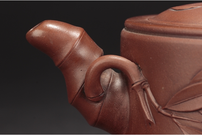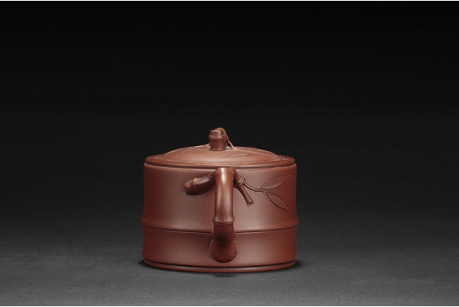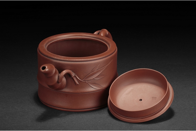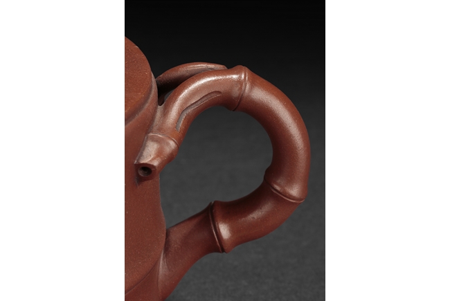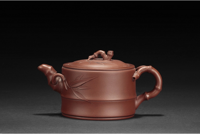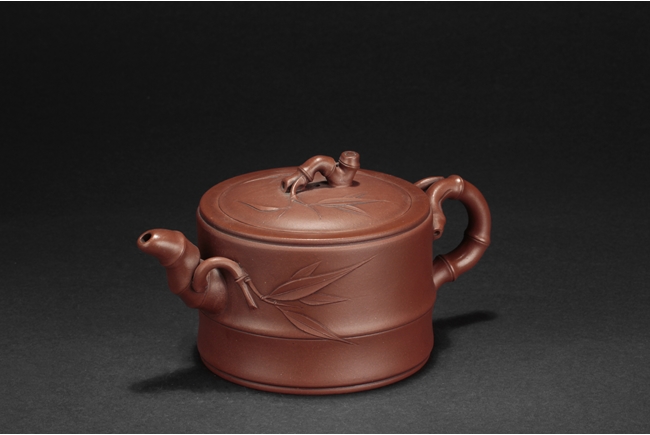 Of flattened cylindrical form, the body segmented similar to bamboo sections, the spout, handle, and finial in curled bamboo sticks form with leaves, the bottom with artist mark "Zhu Kexin".