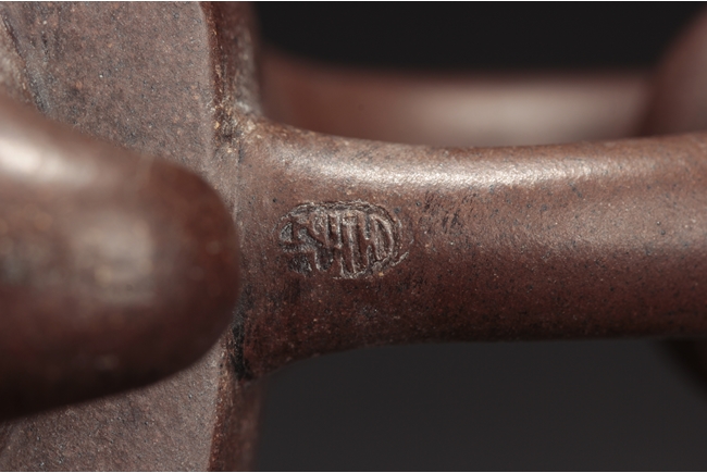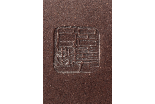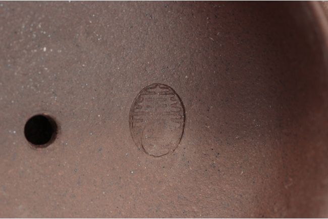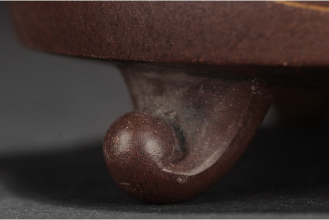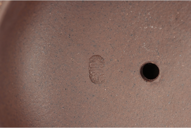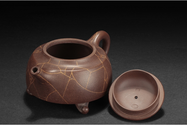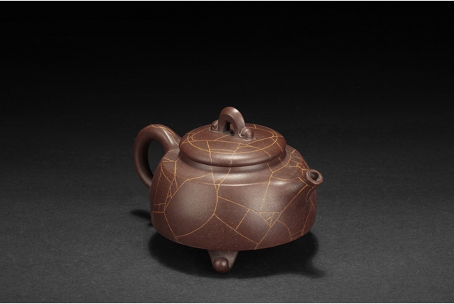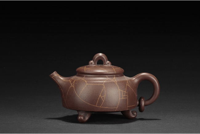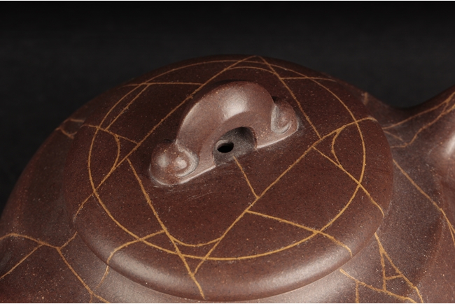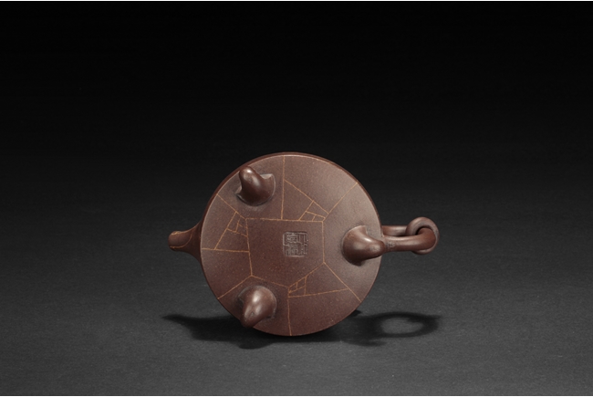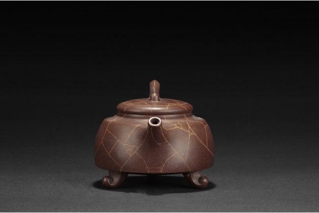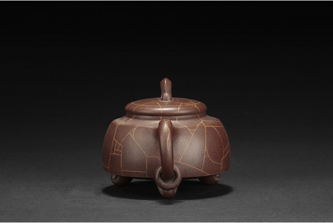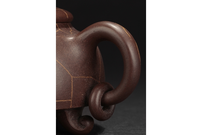 Supported on three curled feet, body of compressed globular form, decorated with crackle patterns, the handle with a looped ring, the finial in arched bridge shape, the bottom of lid and teapot with artist mark "Lü Yaochen".