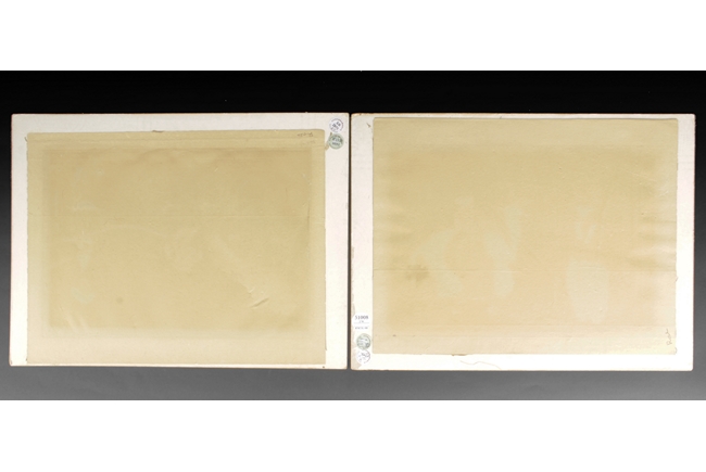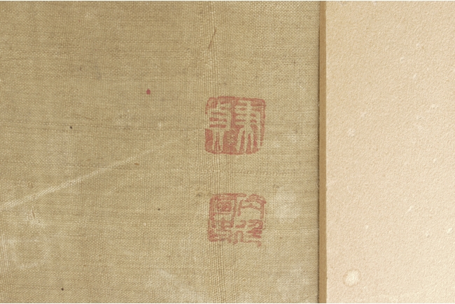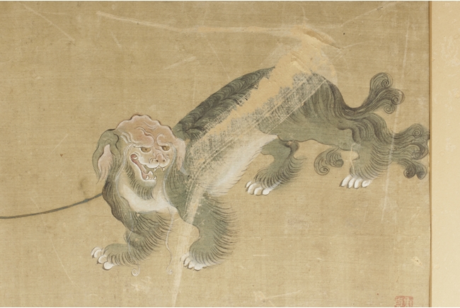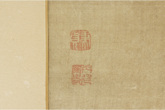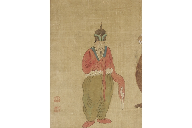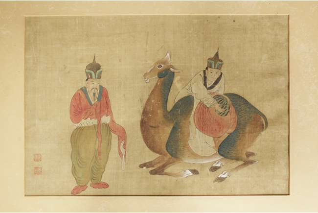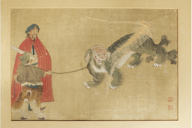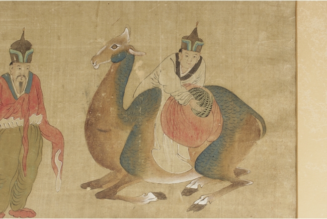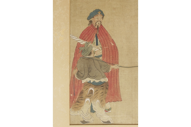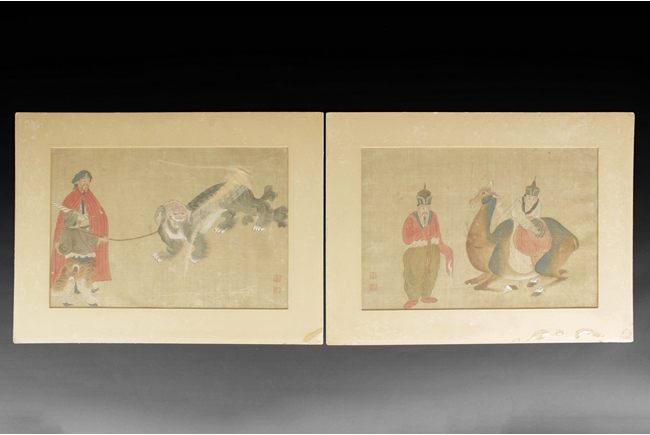 One portrait depicts an animal handler, dressed in tiger fur, leading a leashed tiger to a wealthy person for inspection. The other portrait depicts an attendant taking out a ripe watermelon from the back of a kneeling camel, while another person watches. Artist mark and signature "Jiao Bingzhen" on both paintings. Slight damage to paintings due to age. Ming Dynasty period.