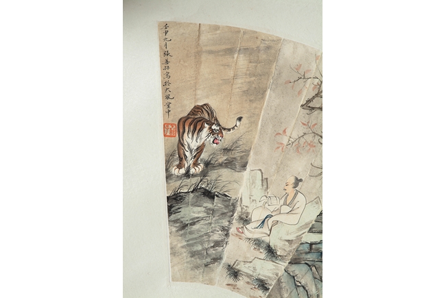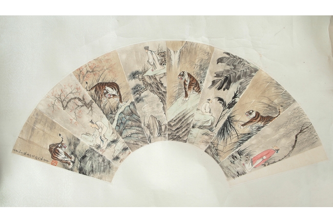 This eight sectioned fan leaf painting with alternating renderings of tiger and scholar. The fan painting bears the signature of "ZHANG SHANZI" and a statement that the painting was executed at "DA FENG TANG".