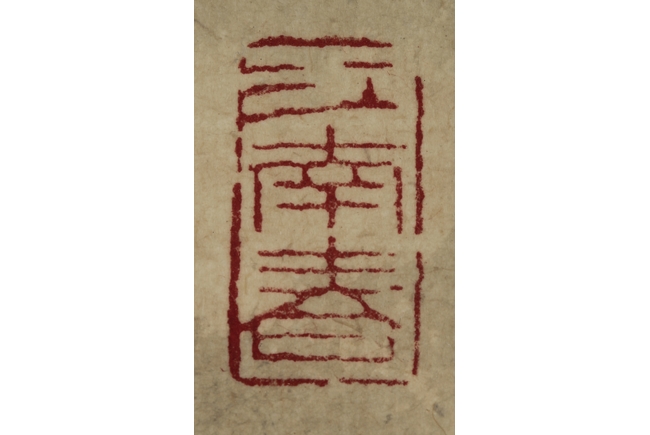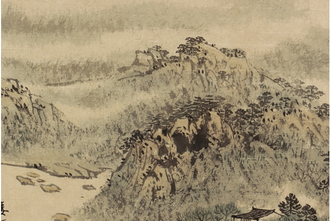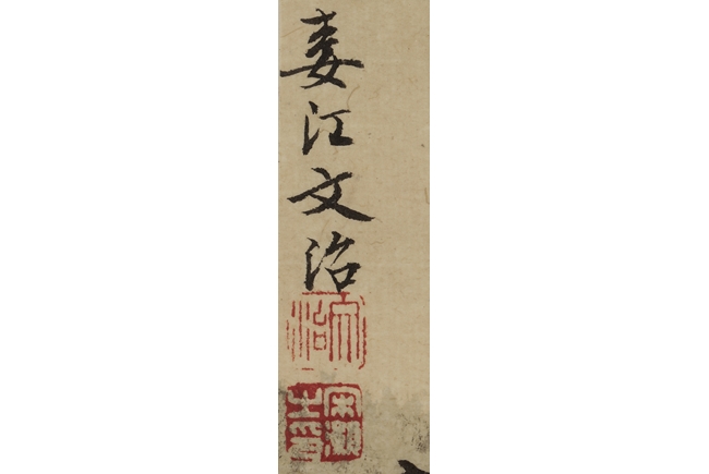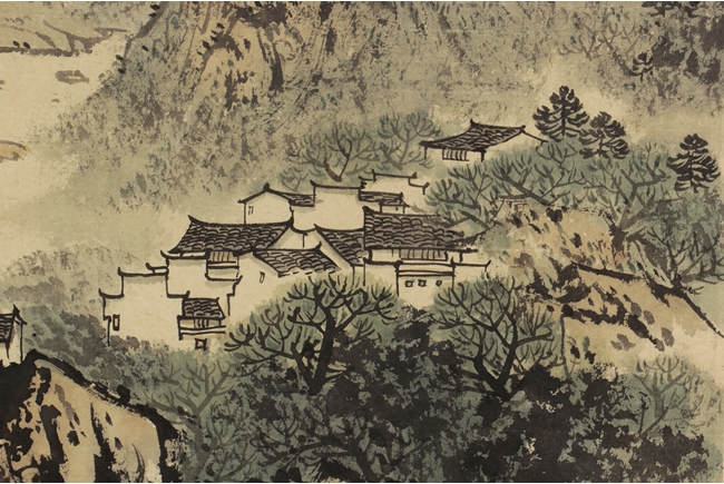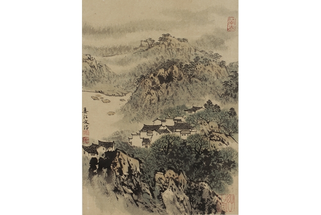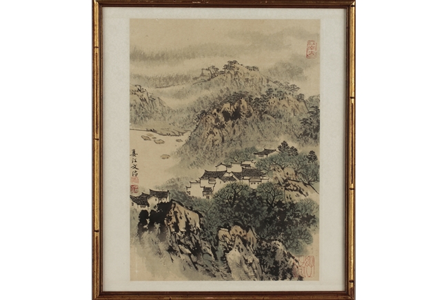 An ink and color on paper painting, framed. The painting depicts a spring landscape scene of Jiangnan area, with villages among mountains and rivers. Artist signature and mark "Wang Wenzhi" on the left side.