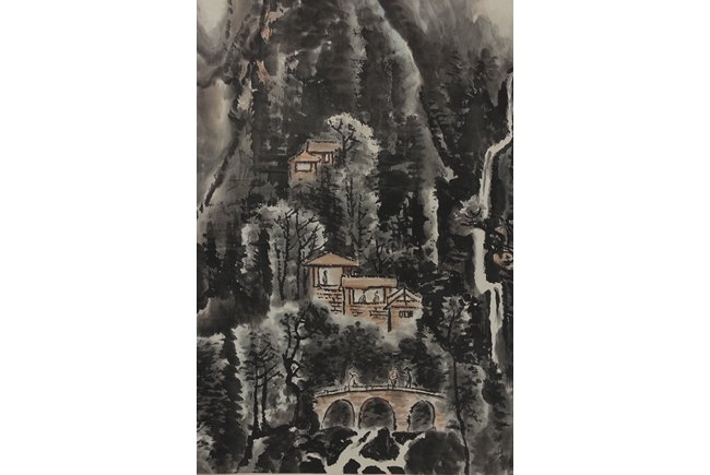 Ink and color on paper, scroll. The painting depicts mountain range scenery, with houses scattered deep within. Artist signature and mark 'Li Keran' on top left".