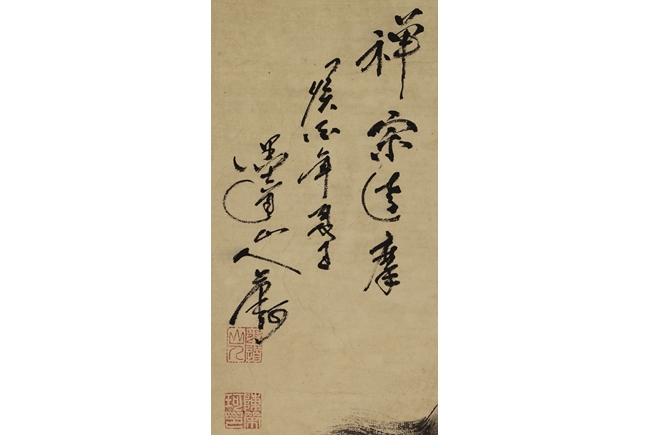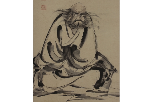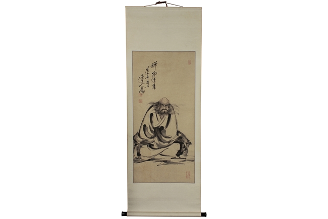Ink on paper painting, hanging scroll. The painting depicts a seated Bodhidharma, with eyes wide open. Chinese verse, artist signature and mark "Modao Shanren" on top left. Additional seal mark on bottom right.