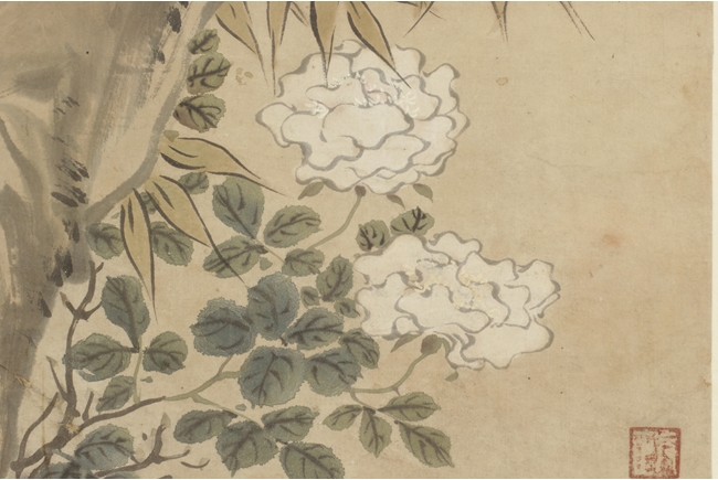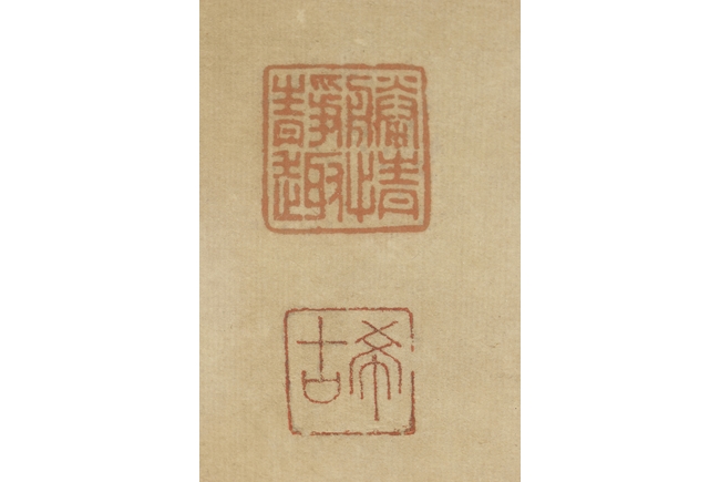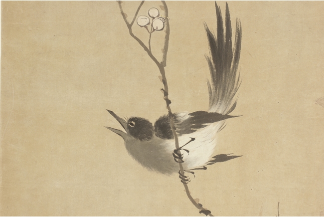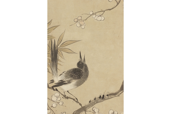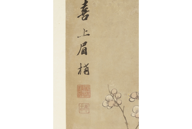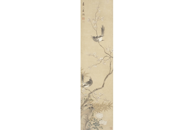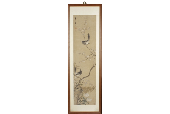 The framed painting depicts two magpie birds perched on plum flower tree branches, one near top, the other near bottom, both looking upwards with beaks open. Artist mark on the left, additional mark on bottom right.