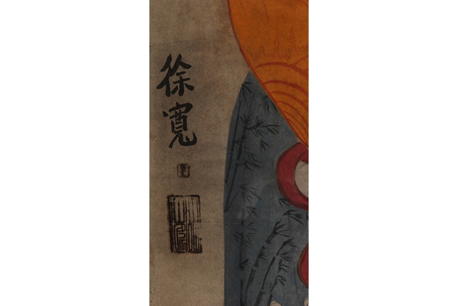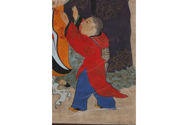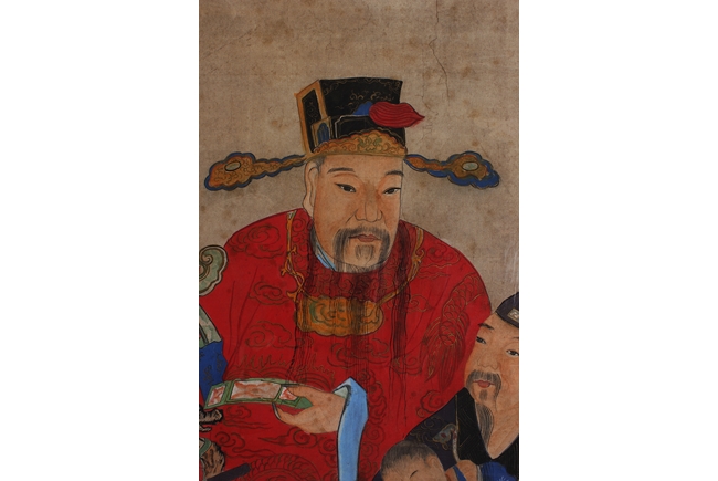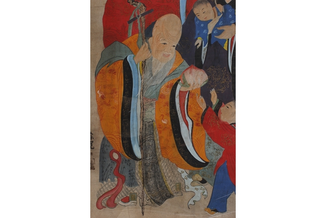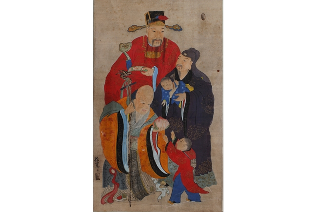 The framed painting depicts the Fu, Lu, and Shou Stars interacting with a young boy and a baby, signifying prosperity. Artist signature and mark 'Xu Kuan' on bottom left.