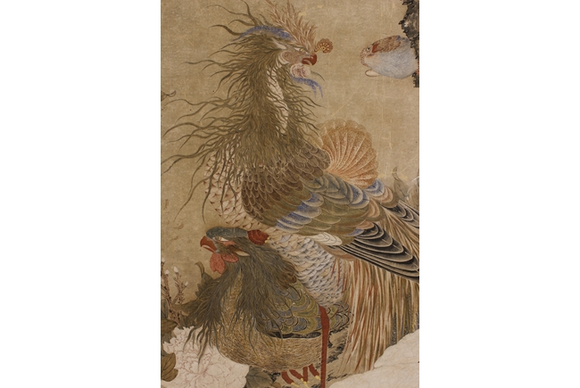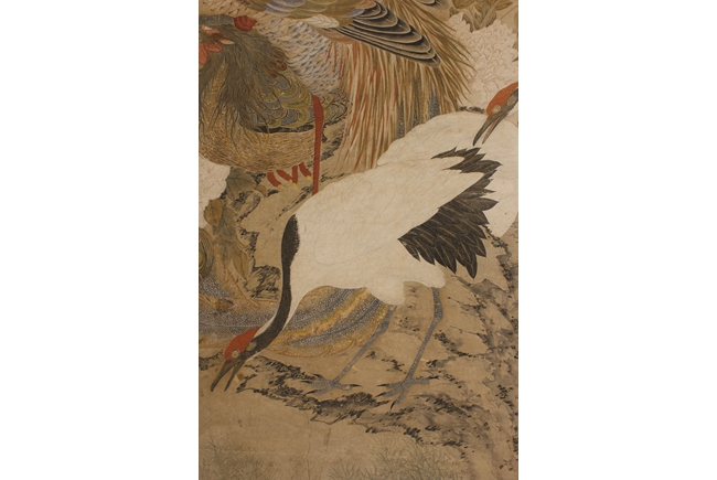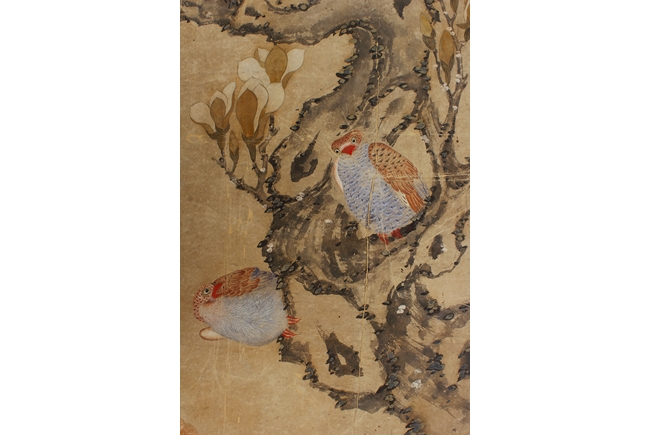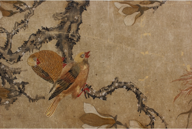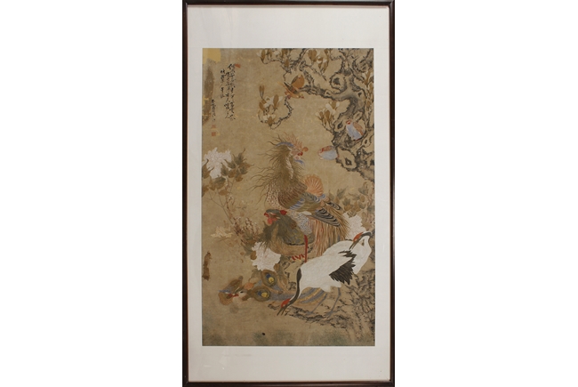 The framed painting depicts many different birds, including cockatrice, cranes, mandarin ducks, magpies, and more, all on a riverside setting, with trees and flowers. Chinese poem calligraphy, artist signature and mark on the top left side.