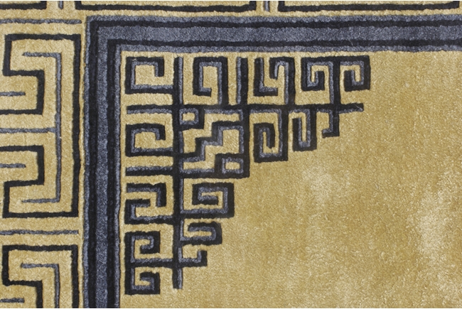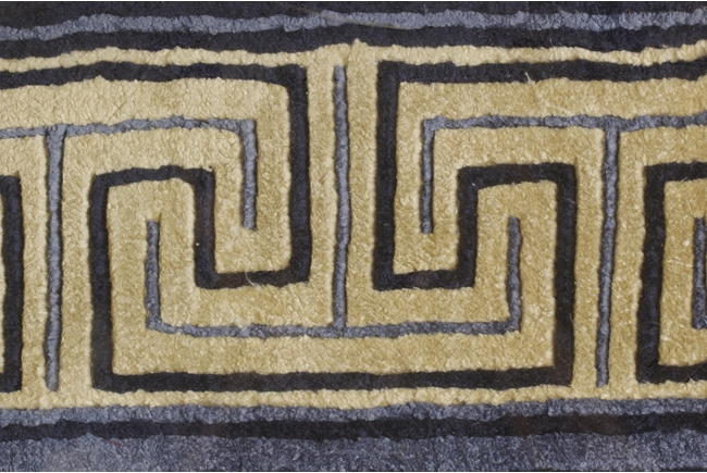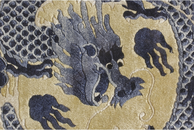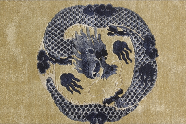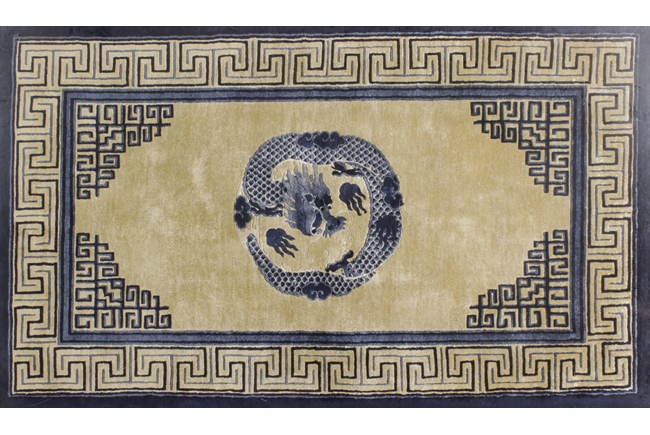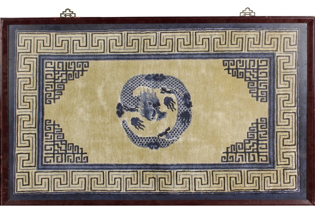 Of rectangular shape, the carpet with a four-claw dragon flying amidst clouds in the center, surrounded by fret border patterns, enclosed in a hanging frame. 19th century.