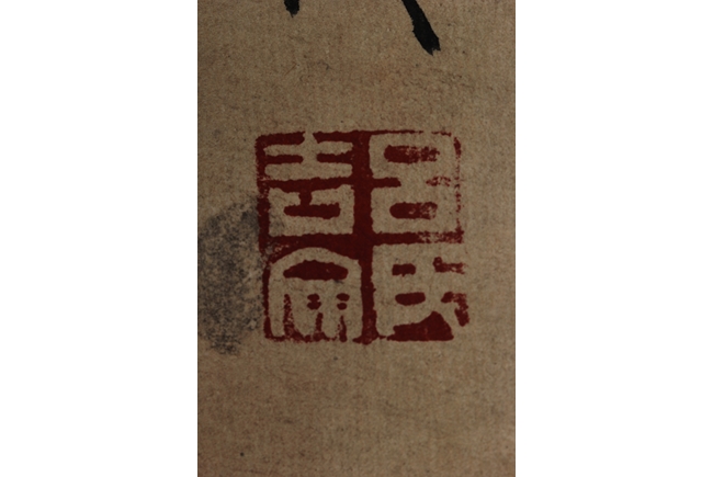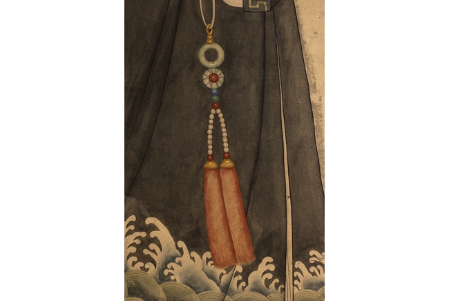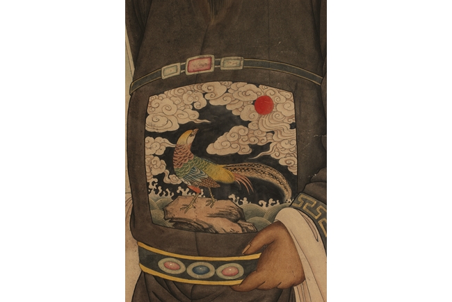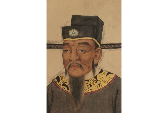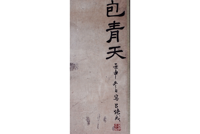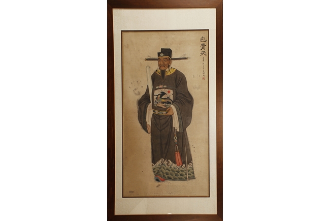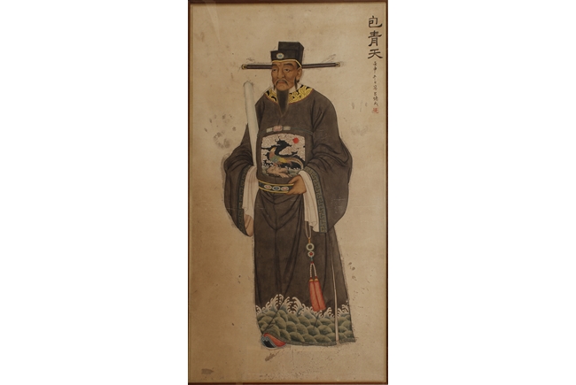 The framed portrait depicts the Song Dynasty official Bao Zheng, a respected cultural symbol of justice in China, dressed in court official clothing. Artist signature and mark 'Lü Huancheng' on top right.
