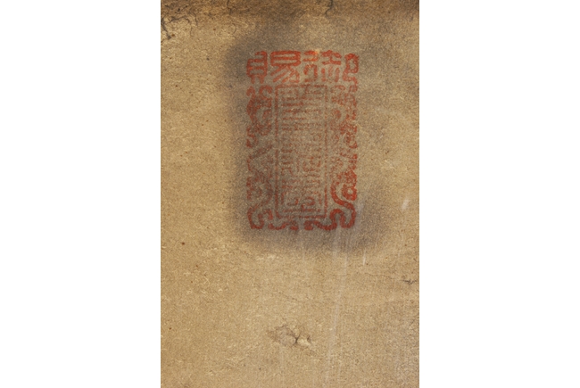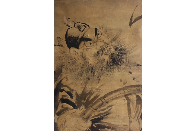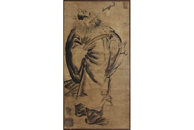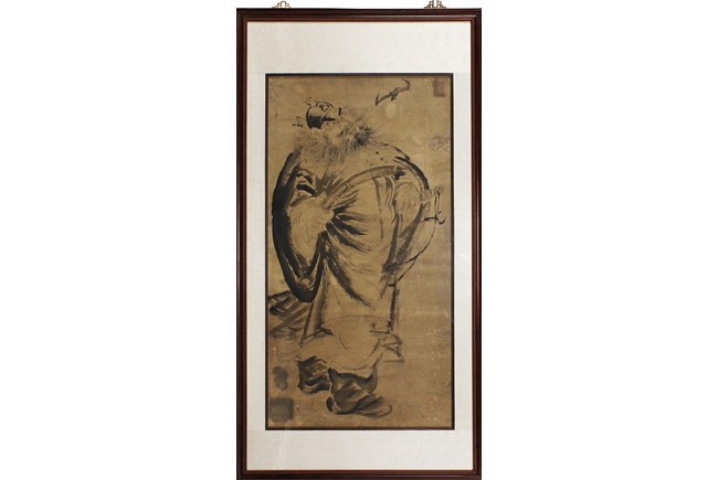 The framed painting depicts Zhong Kui, the vanquisher of ghosts and evil, holding a sword in one hand while following the flying bat. Artist seal on top right.