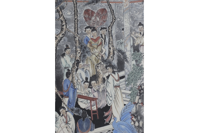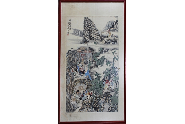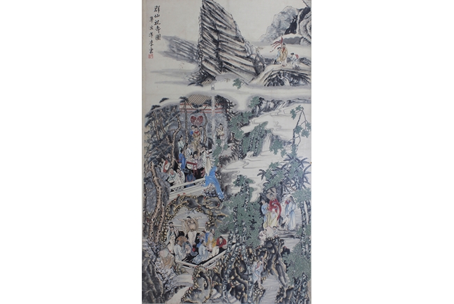 The framed painting depicts a scene of numerous Immortals gathered together in a court setting, celebrating birthday of Xi Wangmu, Queen Mother of the West. Artist signature and mark "Li Zhen" on top left.